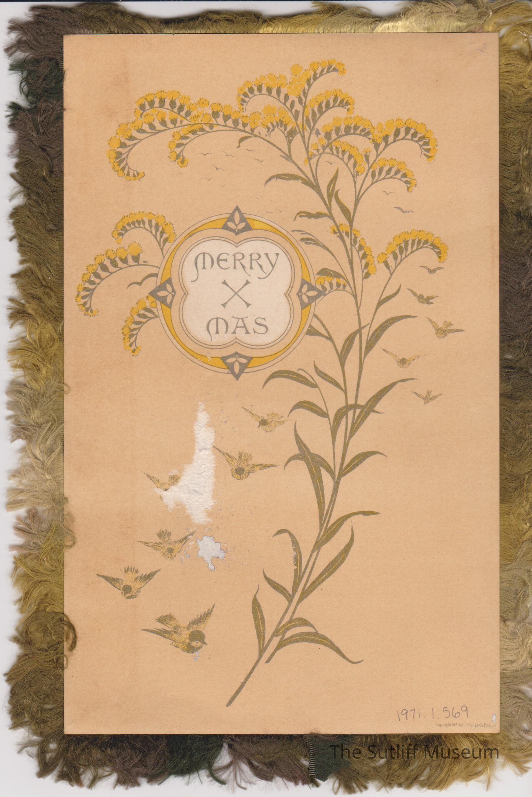 A Christmas greeting card with tan, gold and brown fringe around the edges. The front has a winter scene with plants and birds. "These little messangers I send/ To bear a Greeting/ To my friend./ I bid them haste,/ Not tarry by the way/ To wish all happiness/ On your Xmas day." The reverse has a print of yellow and green floral with birds and "Merry/ X/ Mas". On the reverse side on the bottom right corner in small text, "Copyright 1881 by Praug & Co. Boston"