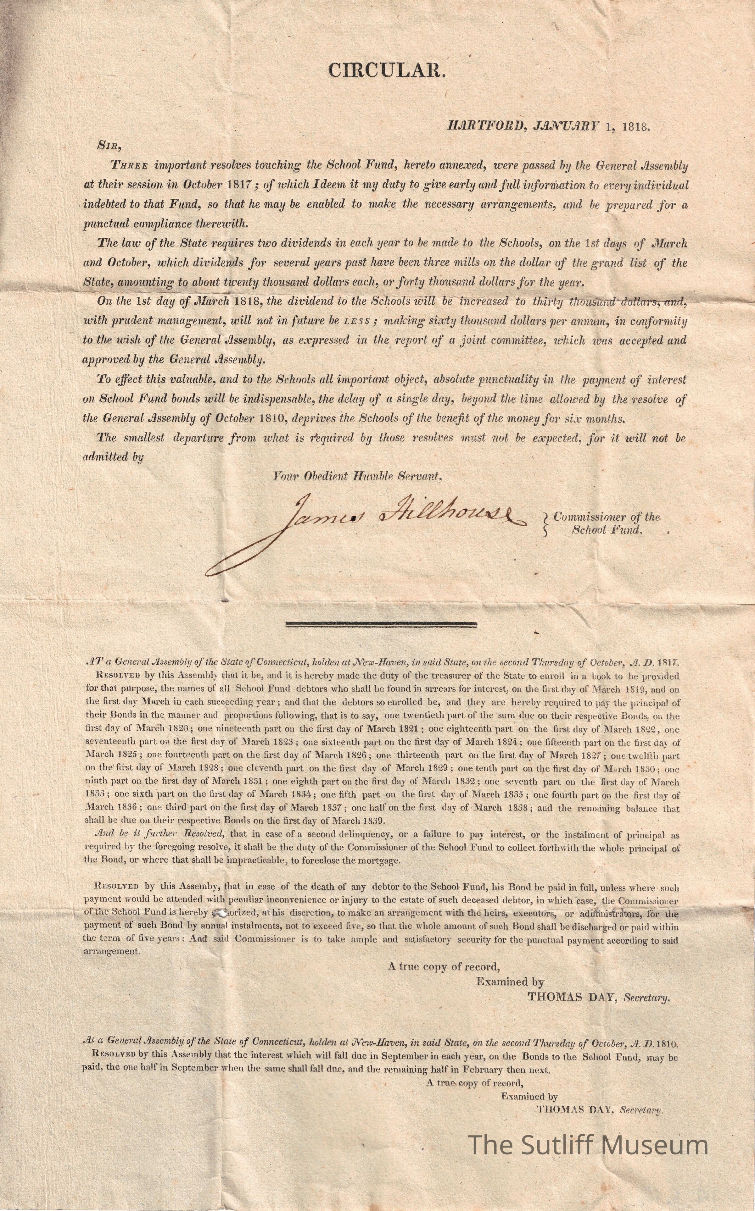 A letter from James Hillhouse regarding the School Fund passed by the General Assembly some months prior.Relationships