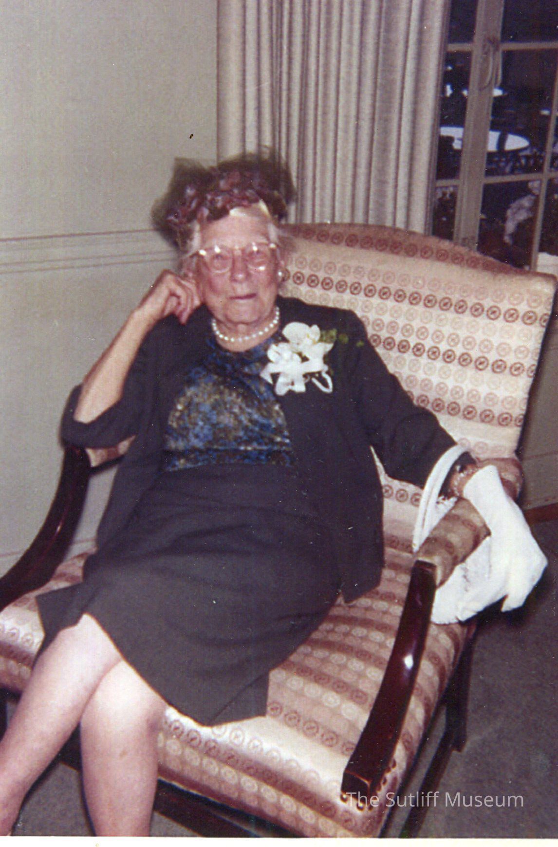 Photograph of Clara Bear Herlinger dressed in a women's suit while sitting in a chair. She was 89 at the time the picture was taken in 1962. She died in 1964 at the age of 91.Collection
