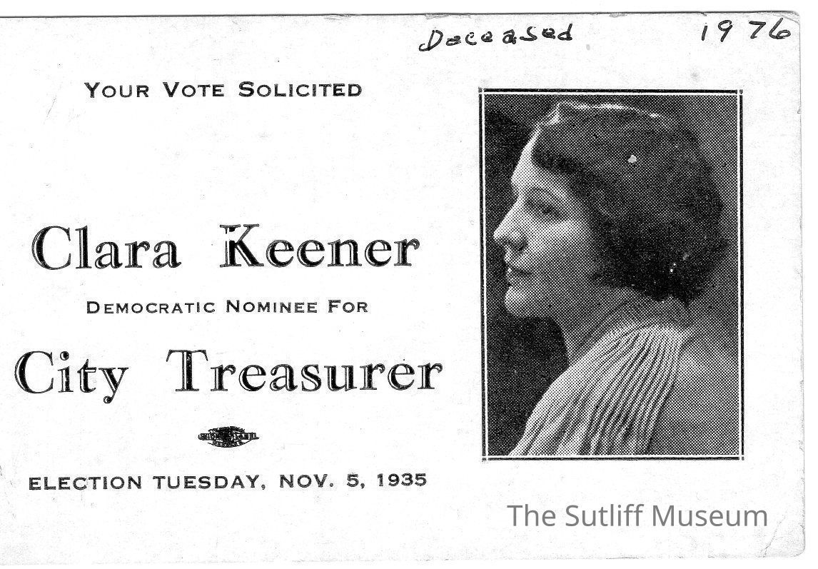 Campaign card for Clara Kenner who was a democratic nominee for City Treasurer in 1935. The election was to be held on Tuesday November 5, 1935. Card features a sideview photo of Clara, who had short dark hair. At the top of the card a handwritten note reads "Deceased 1976."Relationships