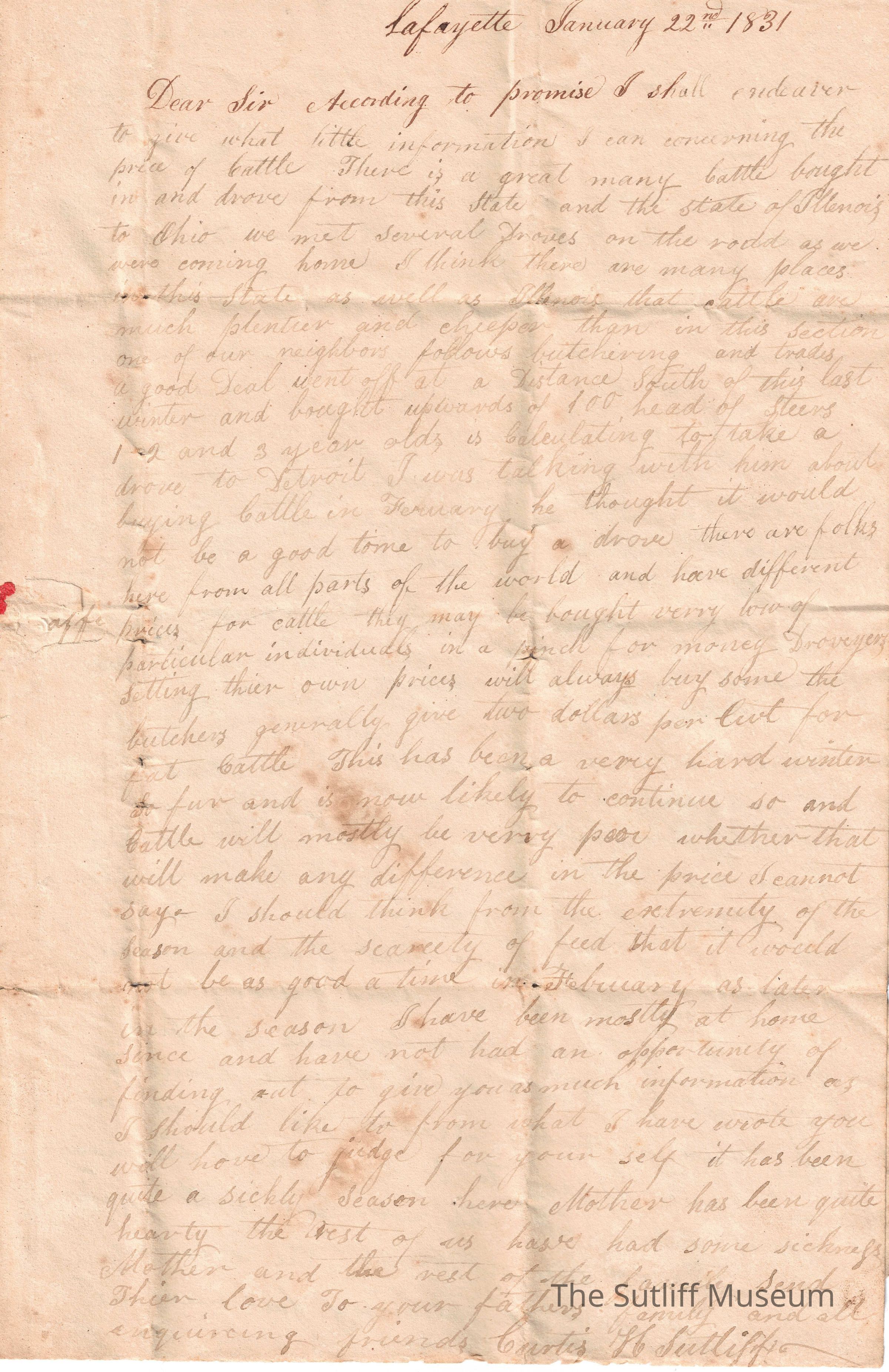 1830s, Correspondence Between Sutliffs, Family, Agriculture, Business, IllnessDescription