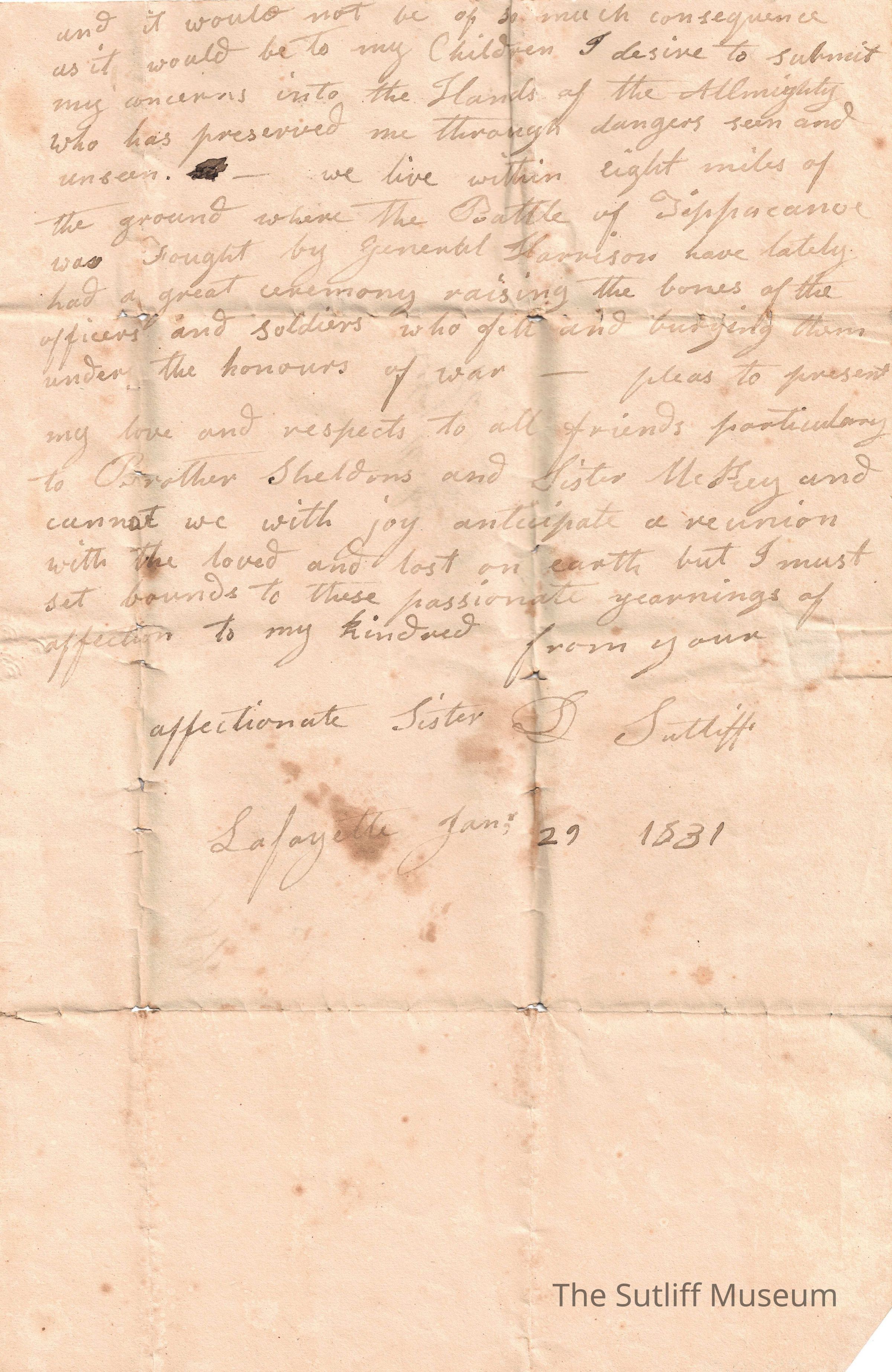 A letter from Deborah Sutliff to Samuel and Ruth Sutliff expressing gratitude for their condolences on the death of her husband, how she is doing in his absence, and mentions the Battle of Tippecanoe.Relationships