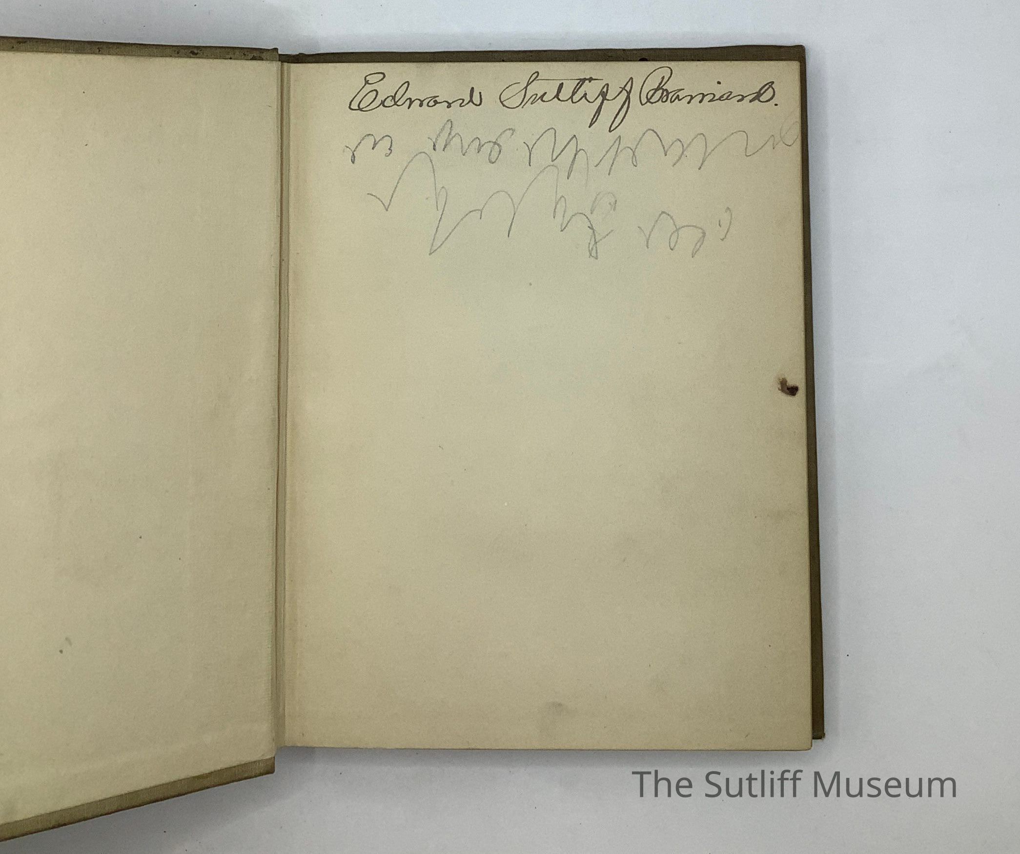 Cloth hard bound copy of 'Through the Looking Glass and what Alice Found There." Handwritten inscription on frontspiece "Edward Sutliff Brainard'" along with childish scribbling.