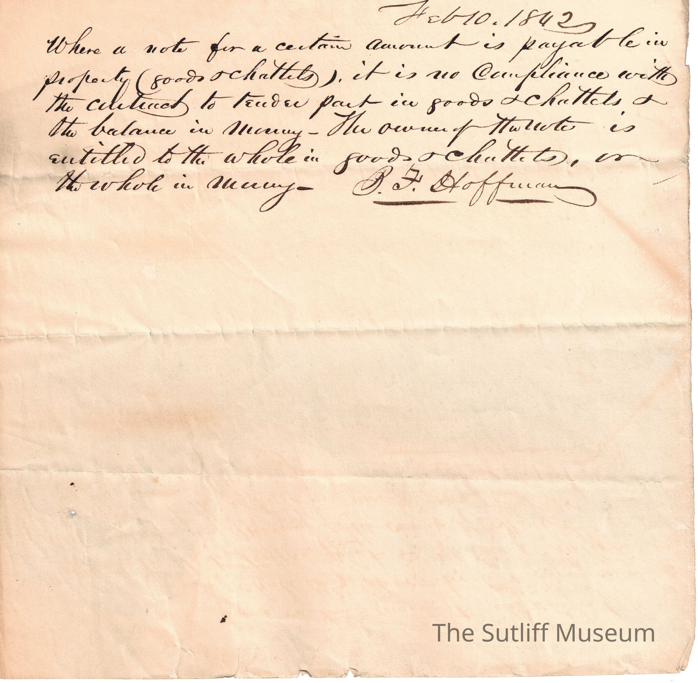 A letter from B.F. Hoffman regarding payment, property and goods.