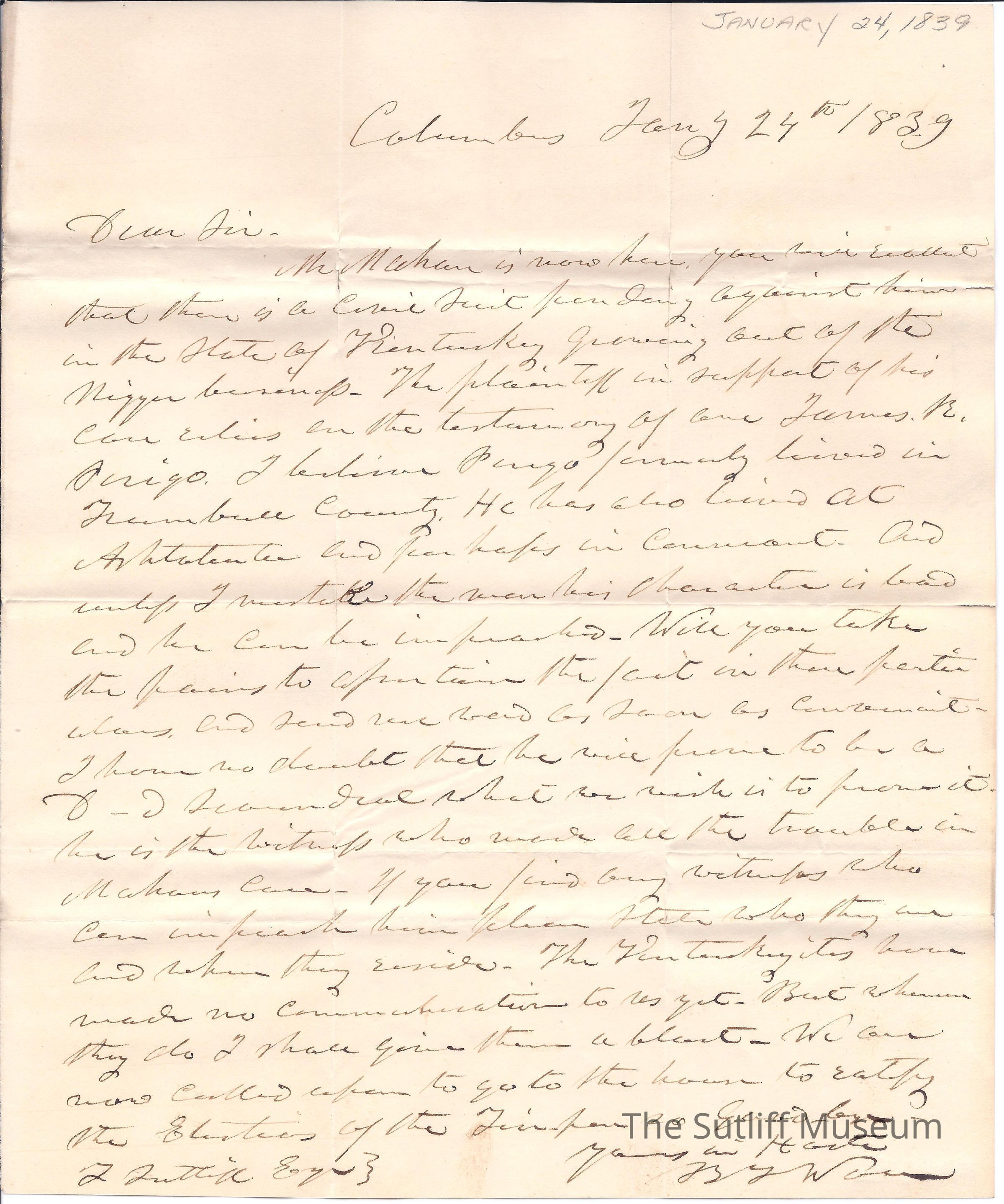 Letter from Benjamin Franklin Wade to Flavel Sutliff regarding a civil suit in Kentucky. Wade would like to impeach the character of Perigo, who is a witness for the plaintiff in a slave case.