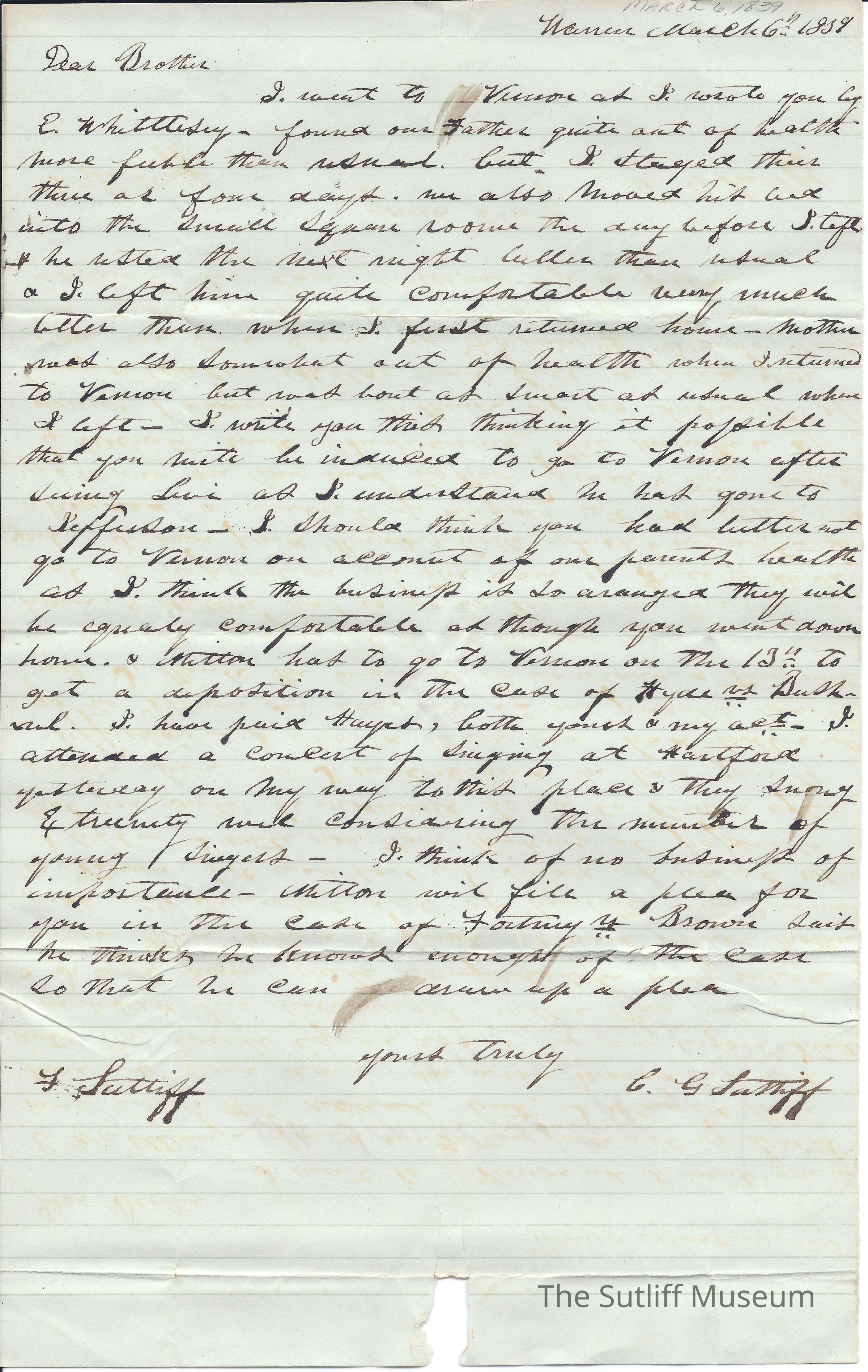 Calvin Sutliff to Flavel Sutliff regarding parents' health and a court case being handled by Milton Sutliff.