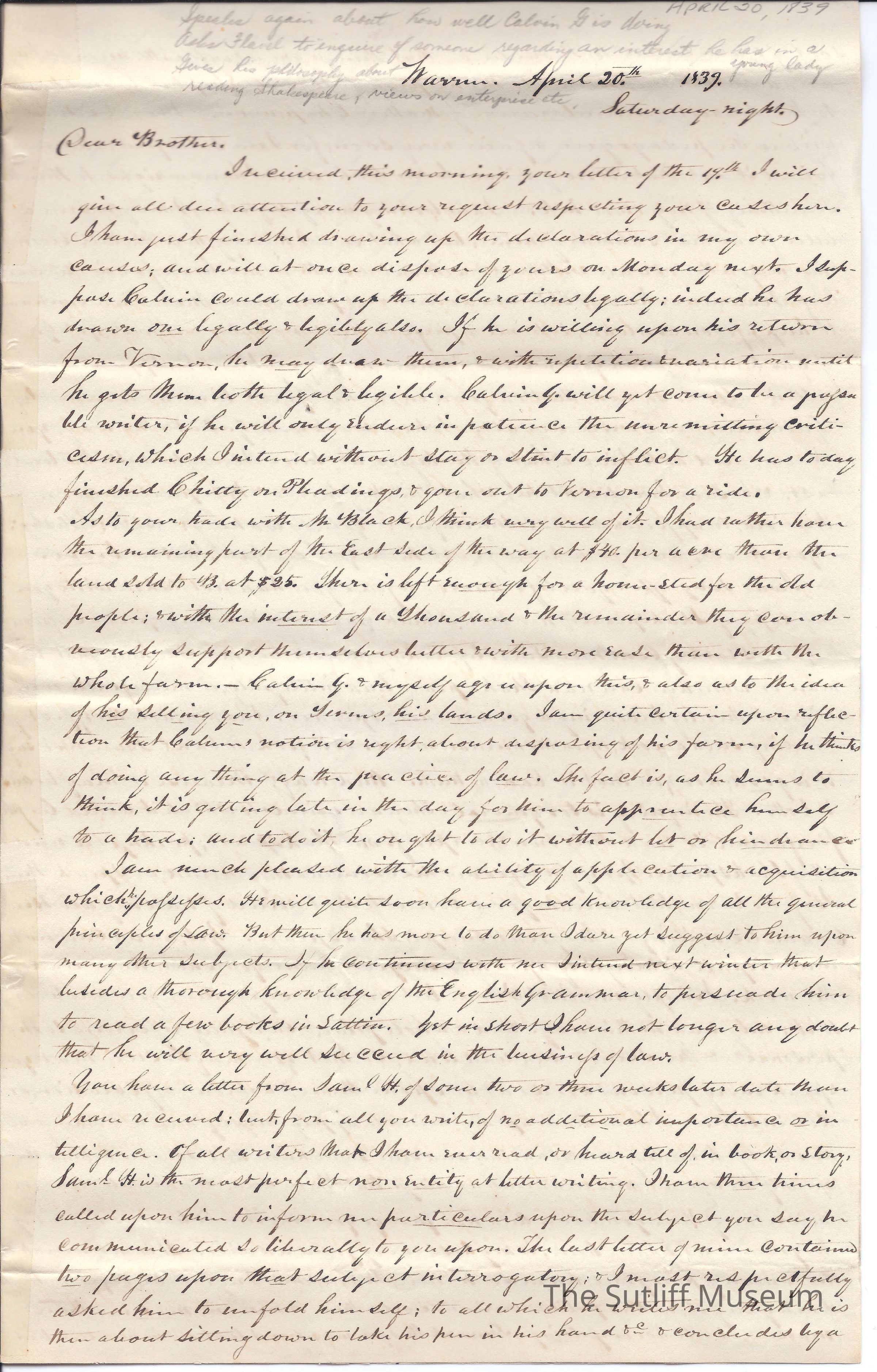 Letter from Milton Sutliff to Flavel Sutliff regarding Calvin's progression as a lawyer and Samuel Harvey's inability to write a thoughtful letter. Also advises Flavel to broaden his reading horizons.Collection