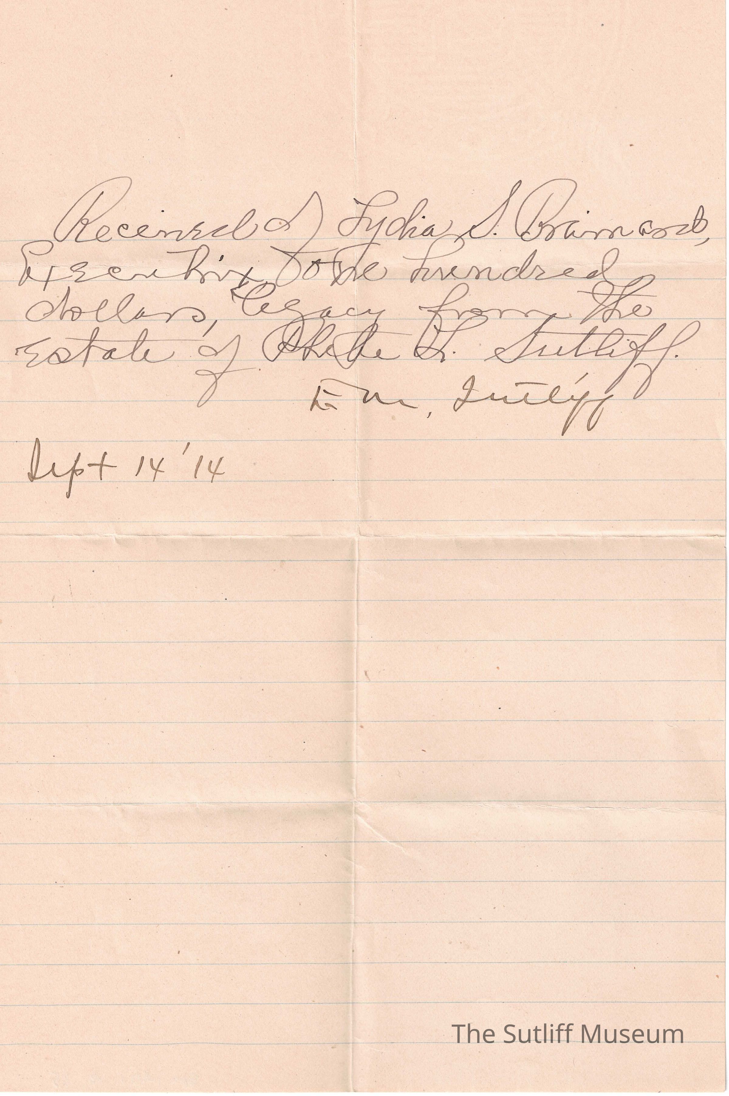 A note from Edward Milton Sutliff to Lydia S. Brainard that he has received his inheritance from Phebe Lord Marvin Sutliff. Associated with Phebe Lord Marvin Sutliff's death receipts.Collection