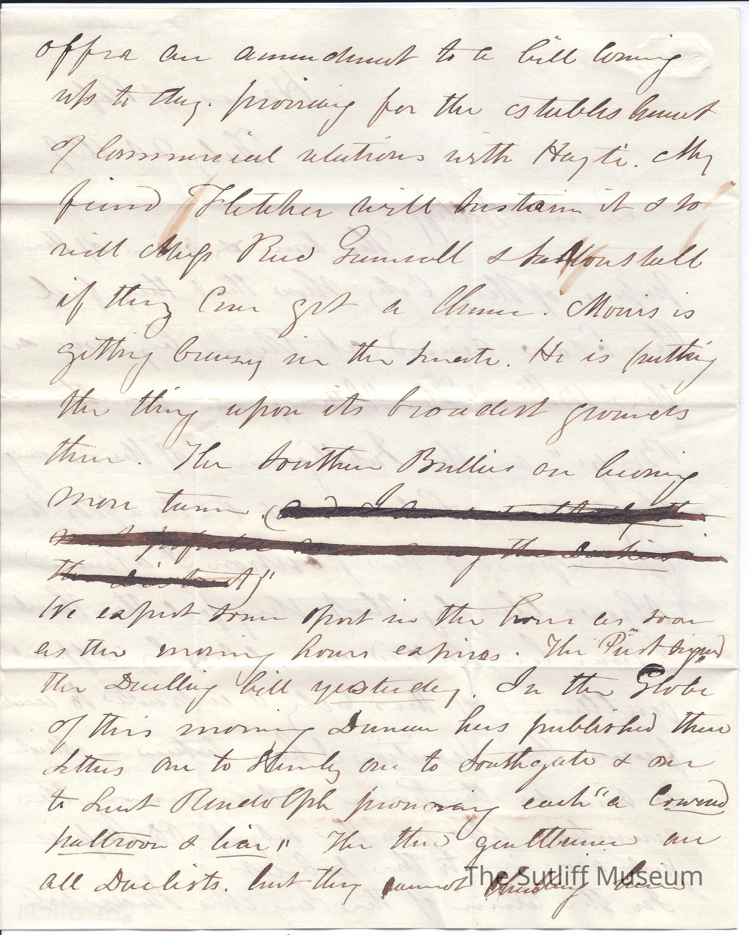 Letter from Joshua Giddings to Flavel Sutliff regarding the environment in the House of Representatives, anger over his movements and the signing of the Dueling bill.