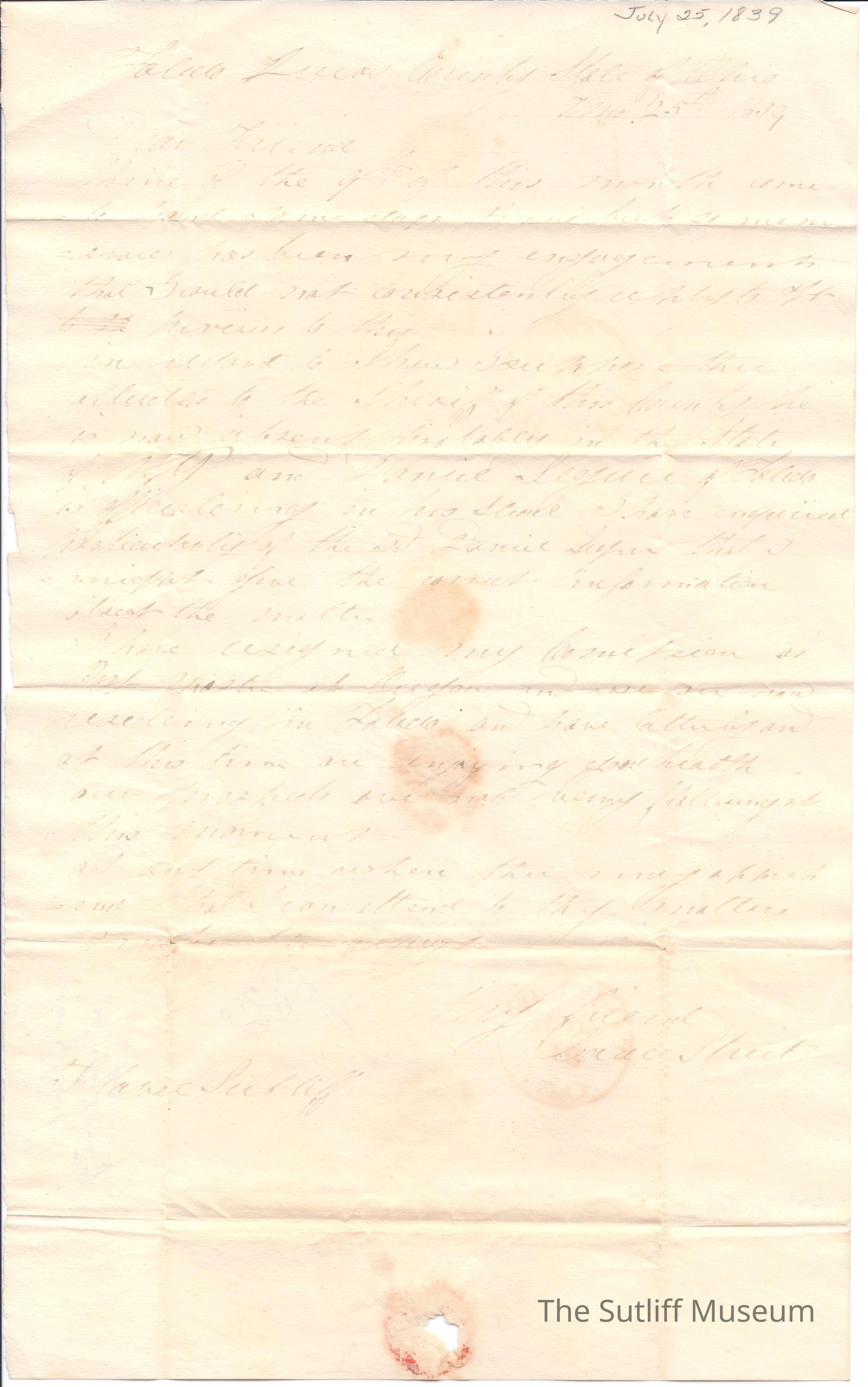 Letter from Isaac Street to Flavel Sutliff regarding a temporary Sheriff in Lucas County and that Street has resigned as Post Master.