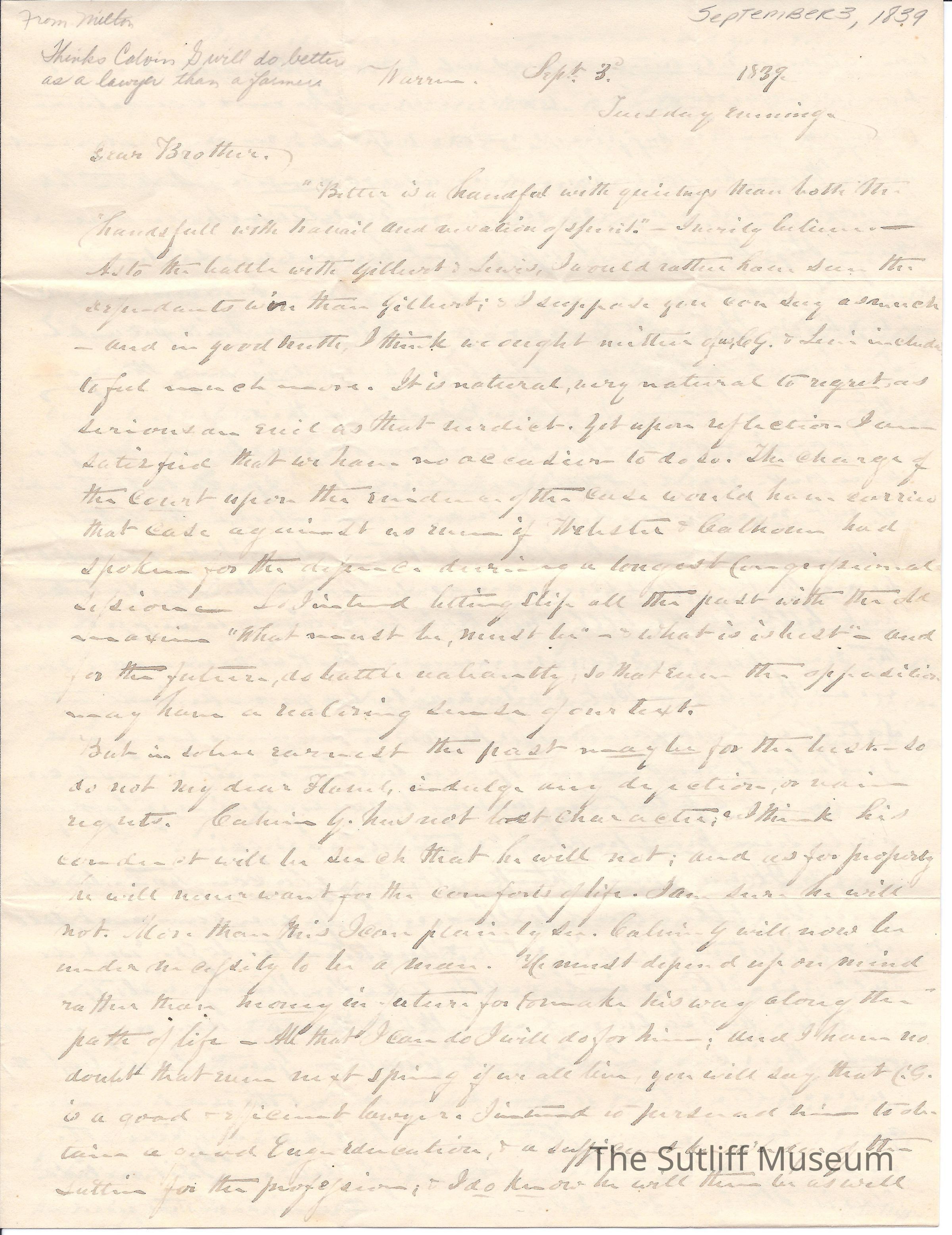 Letter from Milton Sutliff to Flavel Sutliff regarding a suit the family lost. He also advises Flavel to end his dalliance with land speculation.Collection