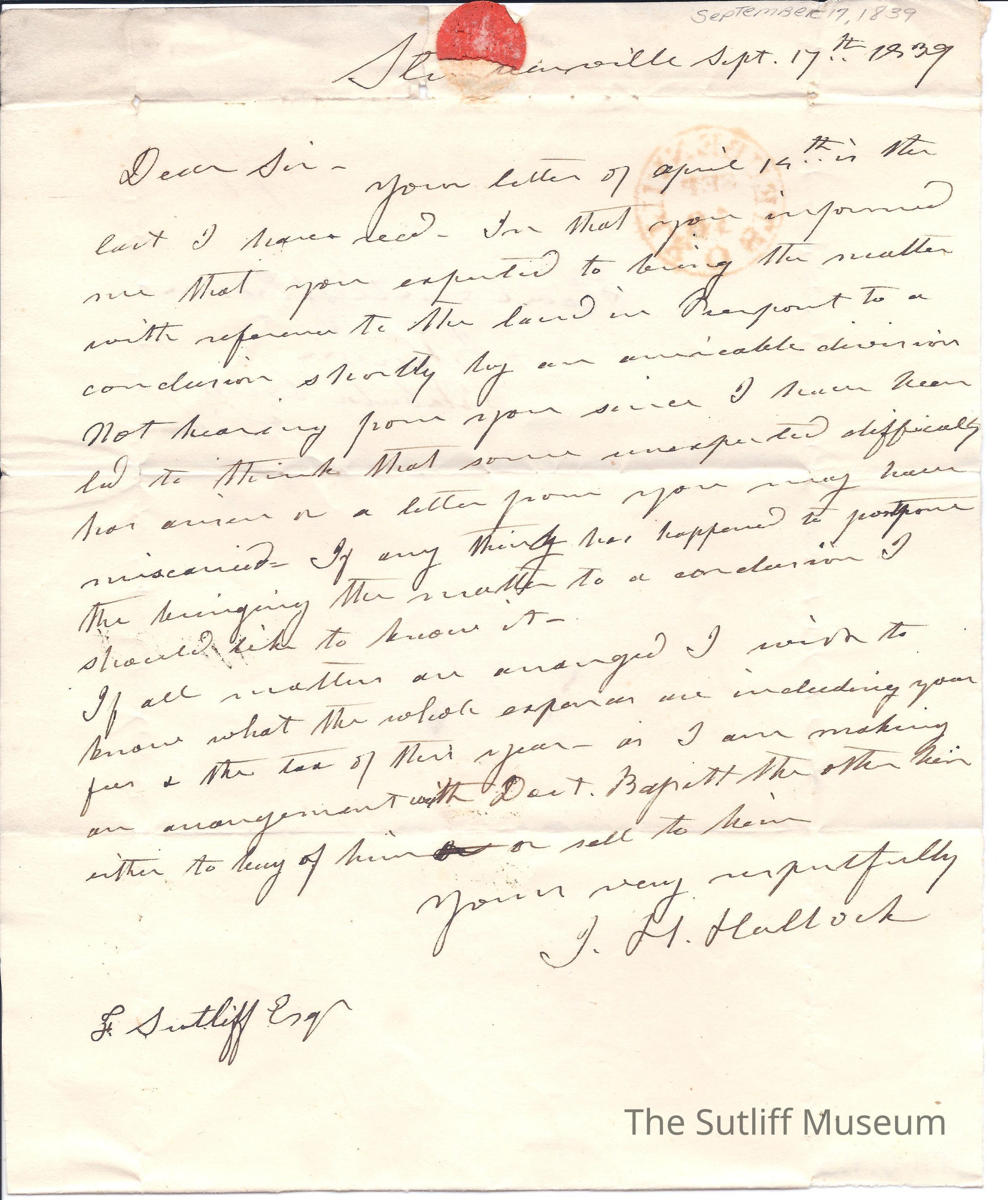 A letter from J.H. Hallock to Flavel Sutliff regarding a request to learn if Flavel has closed a deal for land in Freeport.