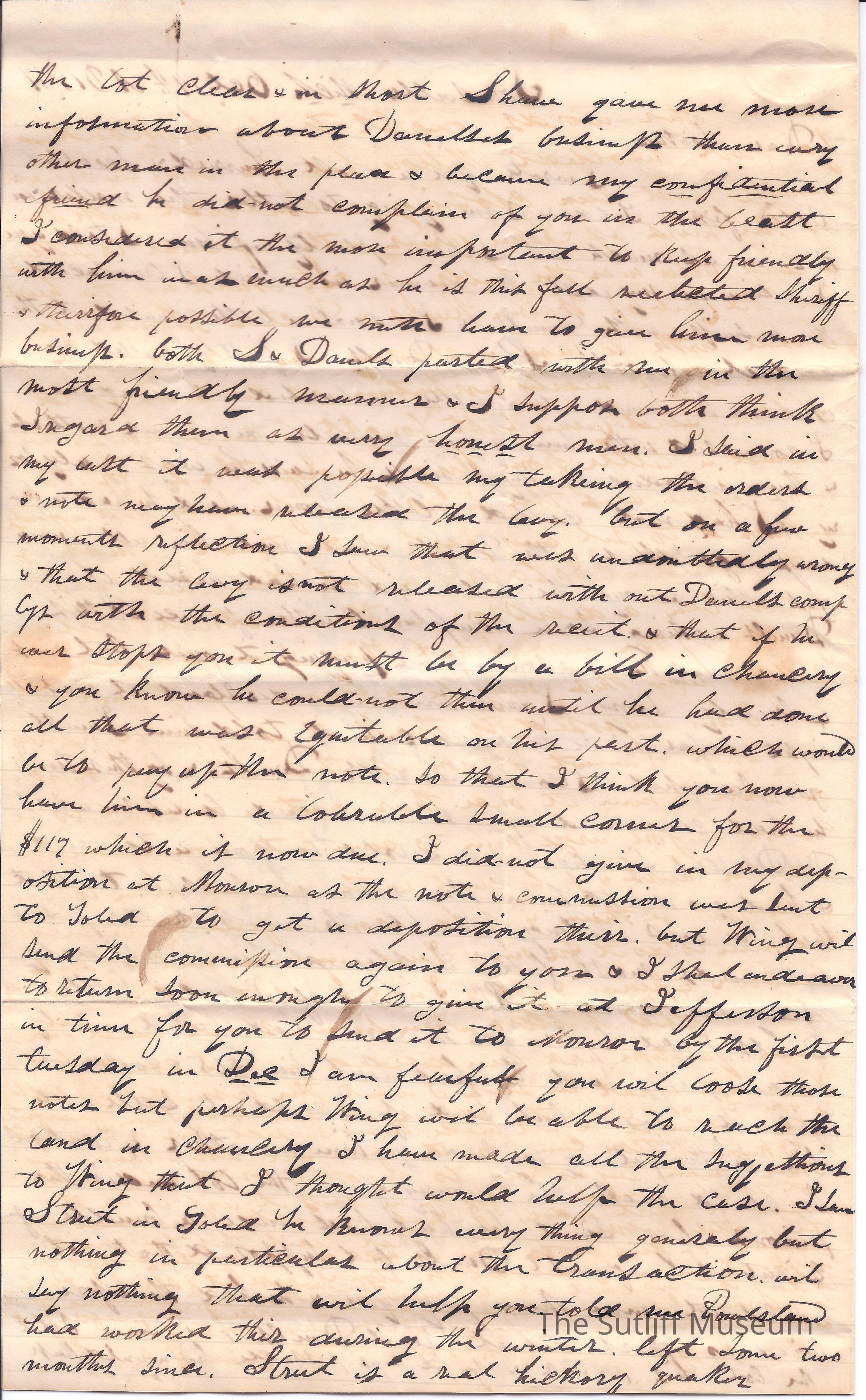 Letter from Calvin Sutliff to Flavel Sutliff as a follow-up on his travels to Toledo and meeting with Daniels. Calvin is in Michigan en route to Chicago.Collection