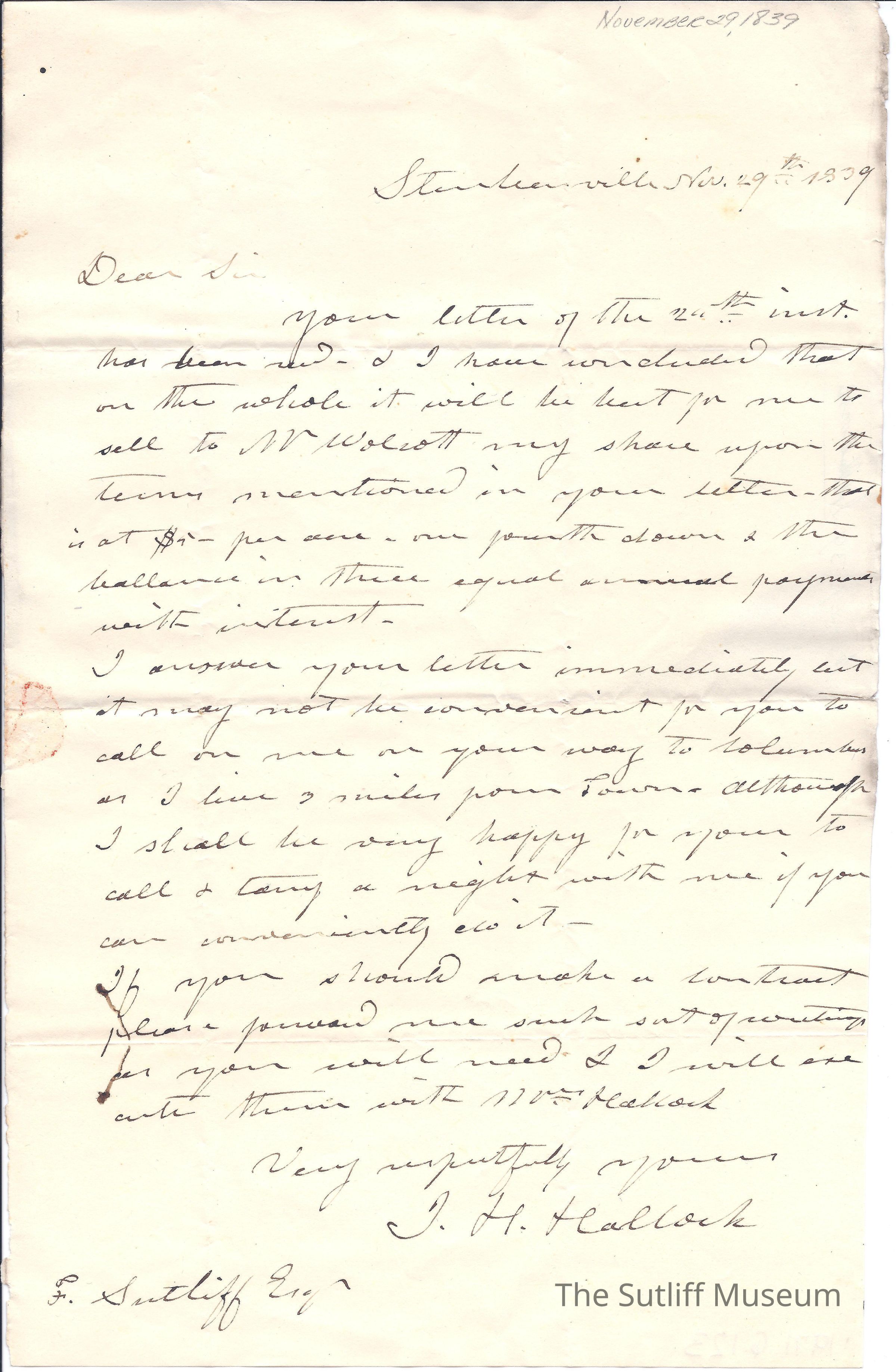 Letter from J.H. Hallock to Flavel Sutliff regarding following Flavel's advice to sell property to Wolcott for $5 per acre.