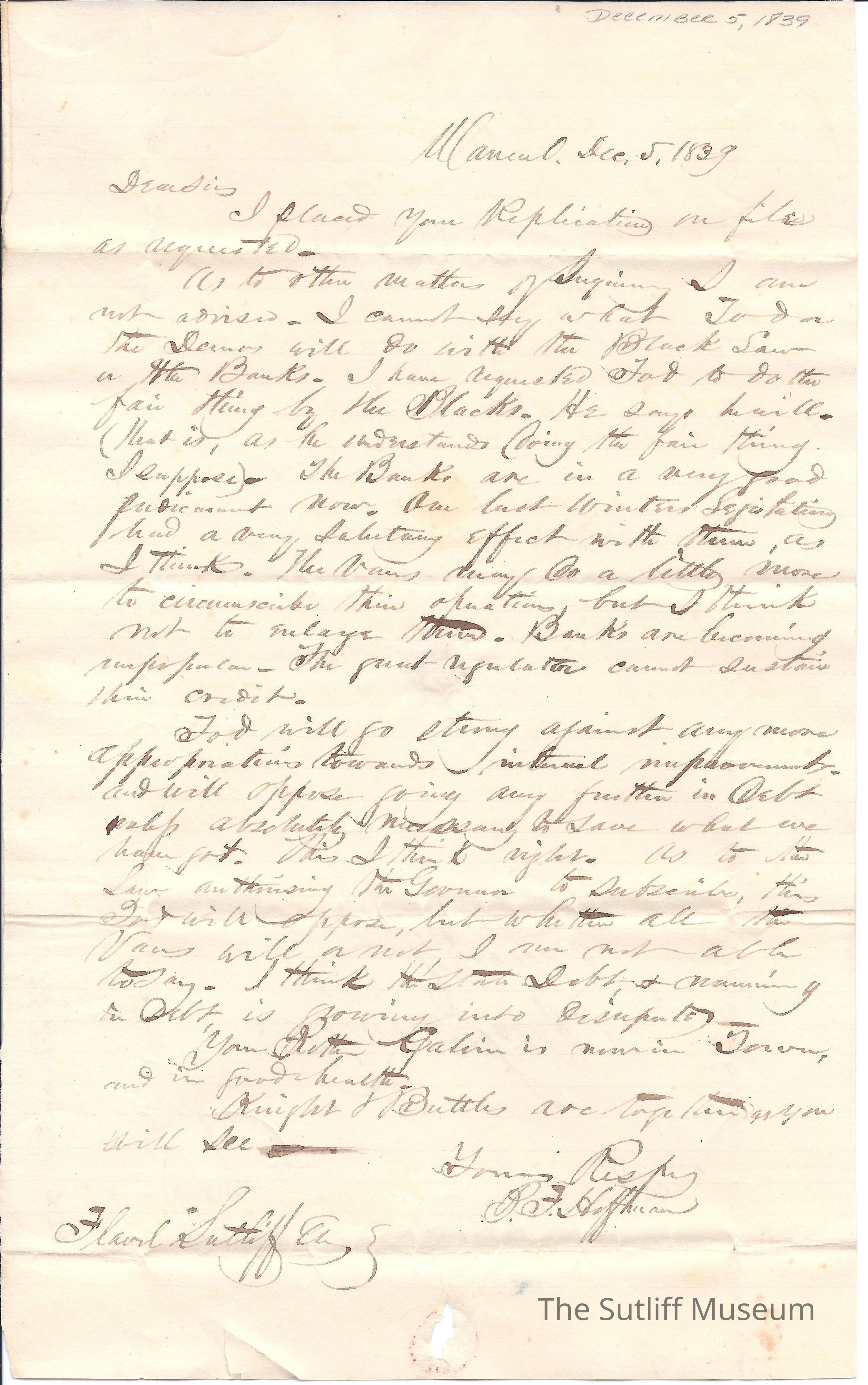 Letter from [B.F. Hoffman] to Flavel Sutliff in response to Flavel's questions about pending state laws to do with Blacks and Banks.