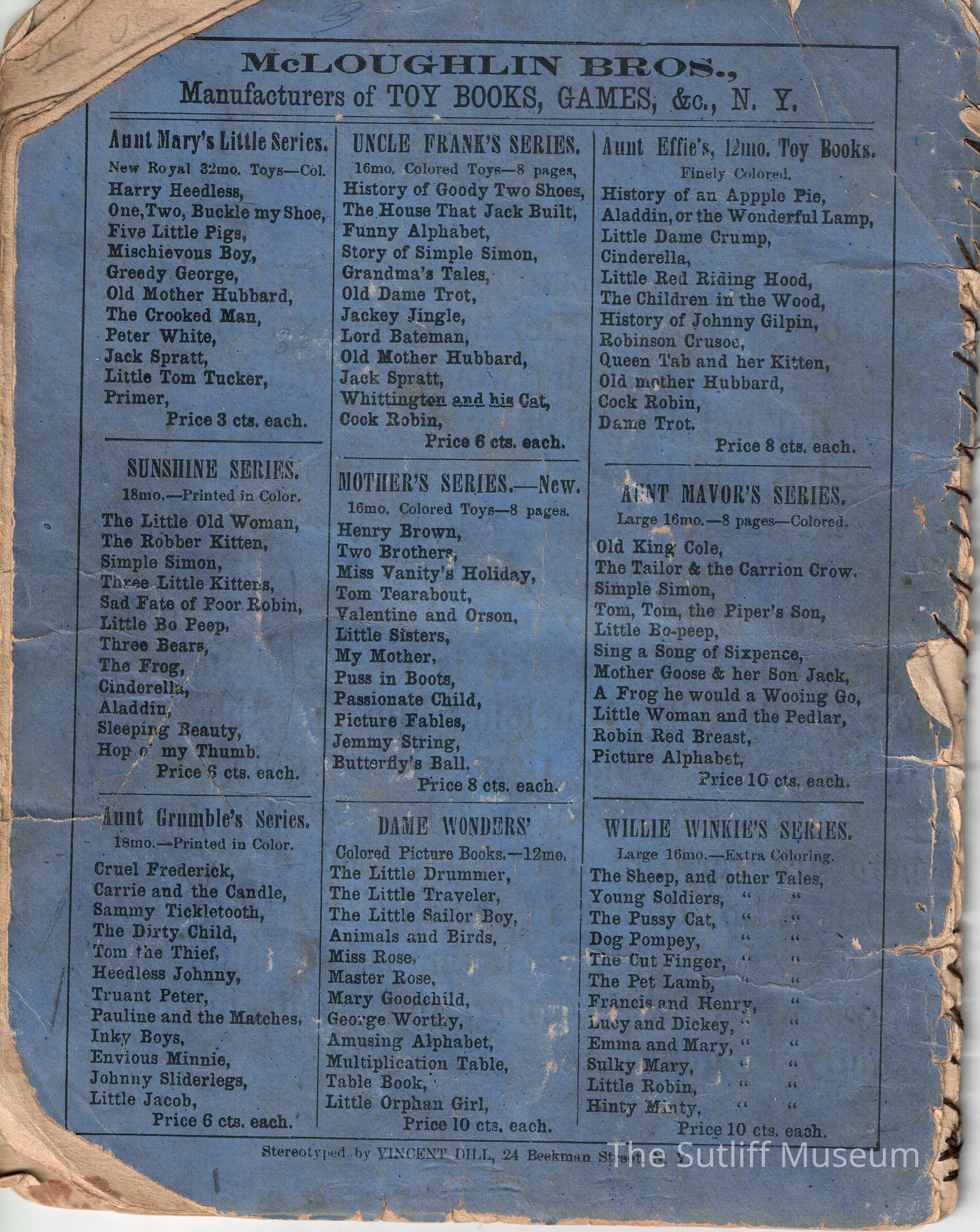 Primer for young students studying penmanship, reading and spelling, published by the McLoughlin Bros. McLoughlin Bros. is considered the premier game publisher, with incredible quality lithography from the 1870s through the 1910s. McLoughlin Bros. was also well known as a book publisher. McLoughlin Bros. was bought by Milton Bradley in 1918. Some McLoughlin games were also produced under the Milton Bradley moniker after the purchase.