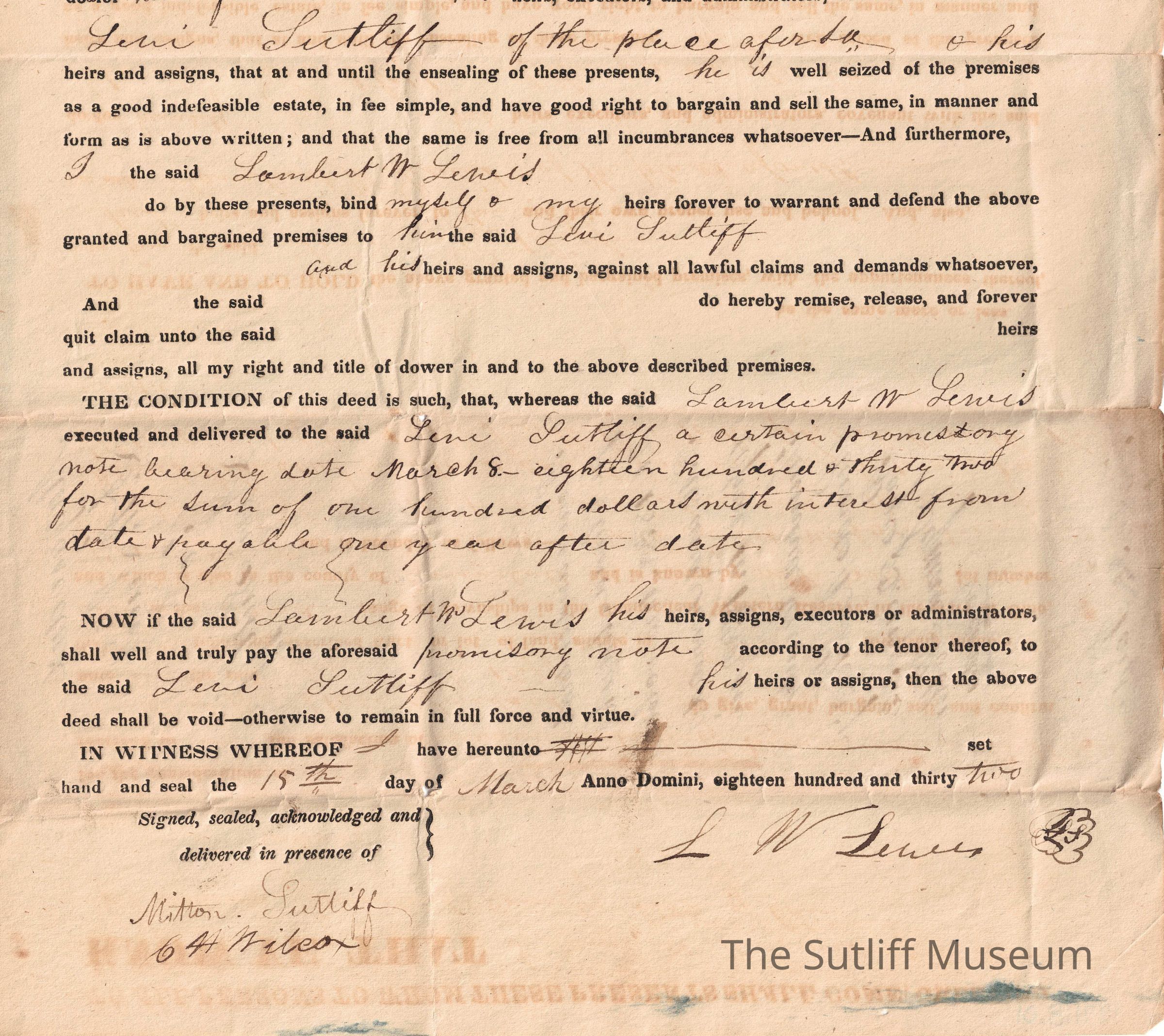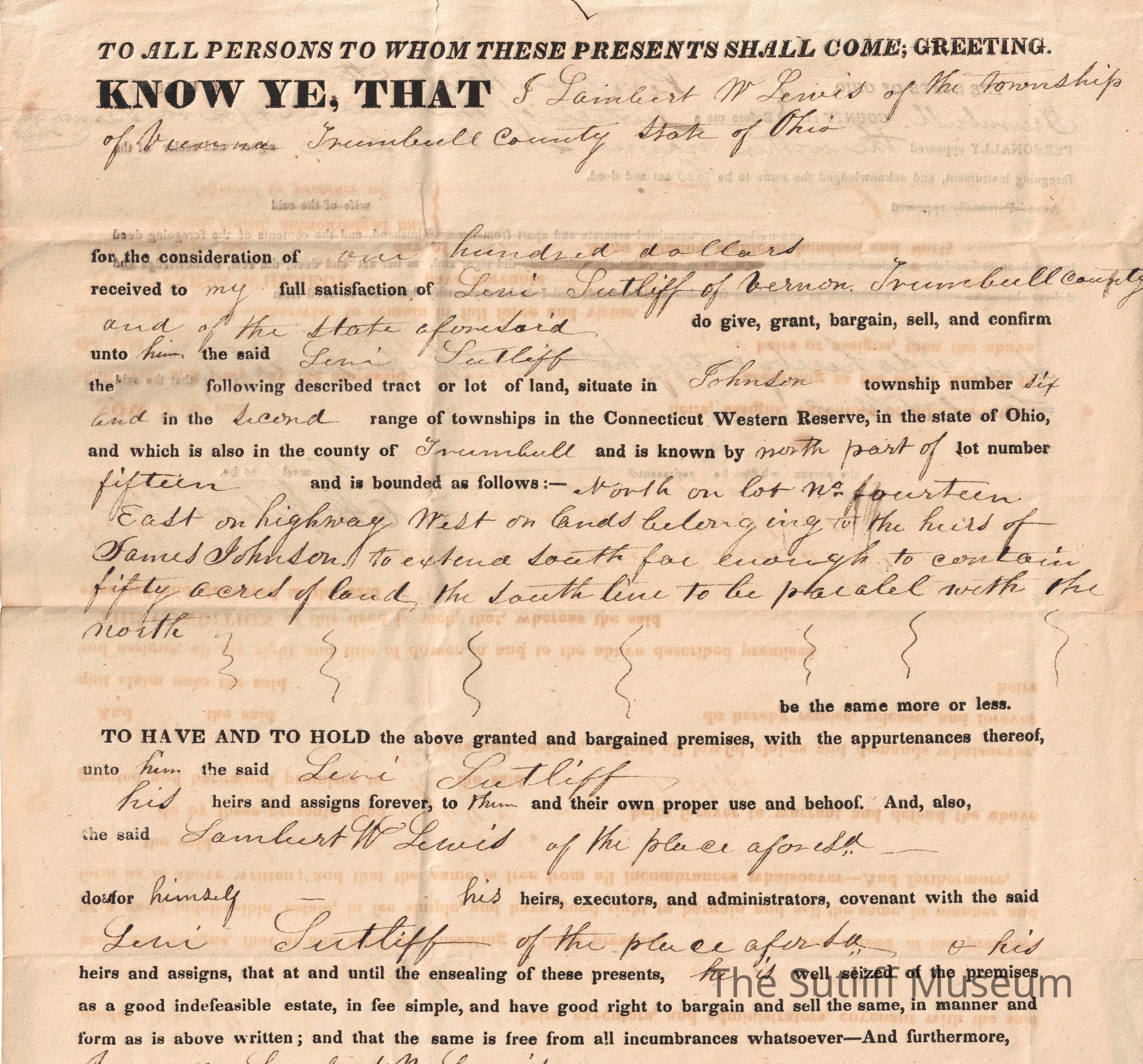 A legal transfer of land in Johnson township to Levi Sutliff, witnessed by Milton Sutliff.Relationships