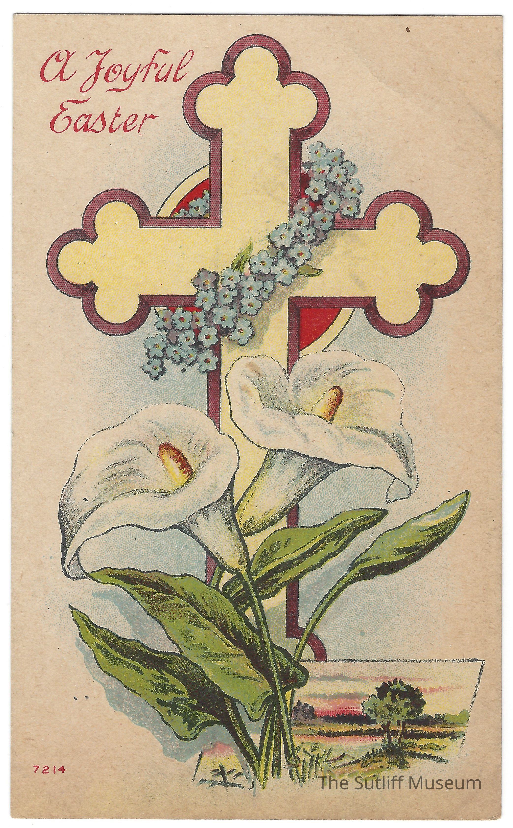 Easter postcard that depicts a cross with blue flowers and 2 white lilies.