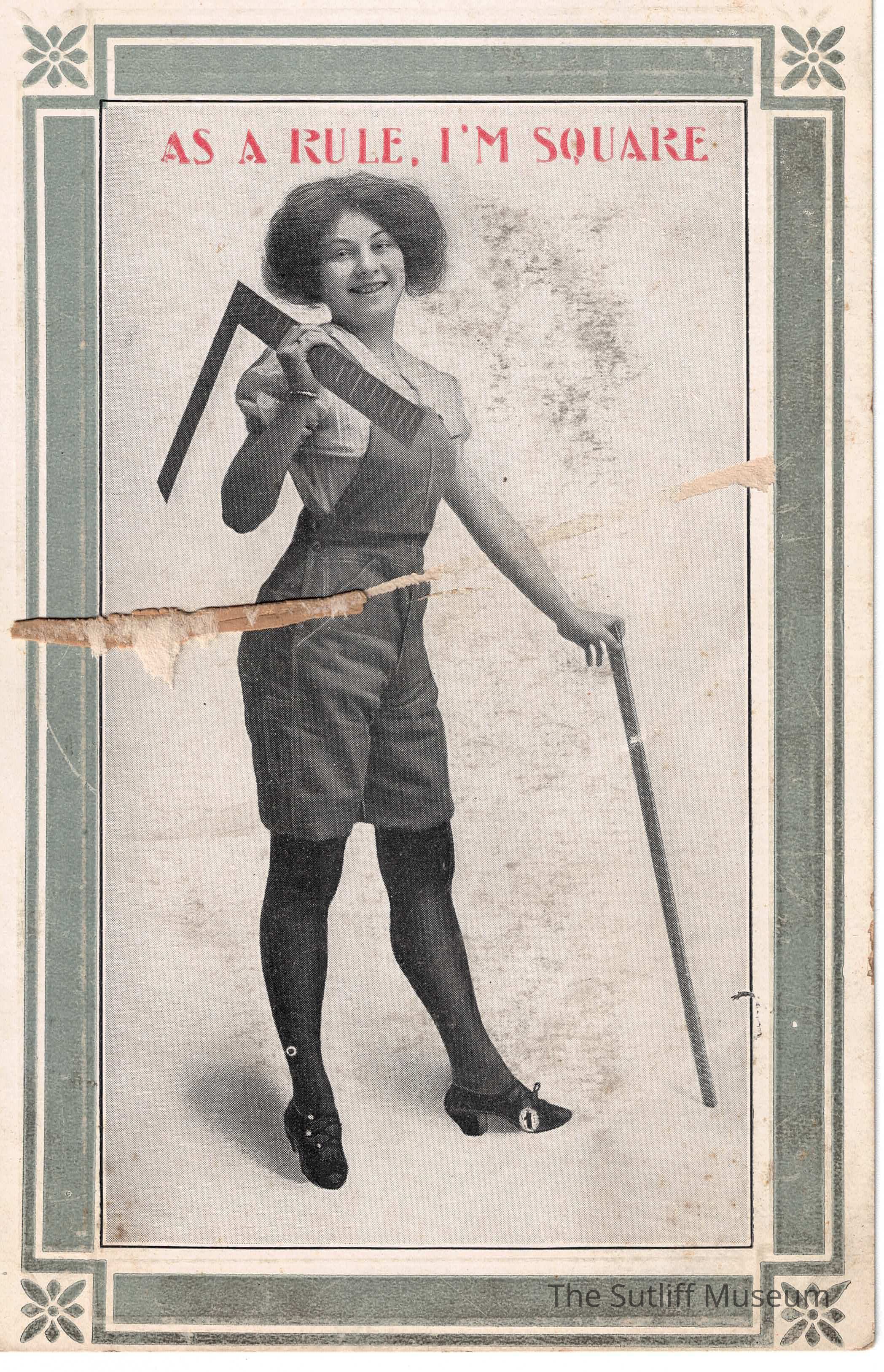 Vertical orientation. A postcard with faded blue border and a woman in man's clothing holding a square ruler and a stick. "As a rule, I'm square" printed in pink over top The back is split with one side for message and one side for mailing address. Postage needed. SB series 391. Made in US.