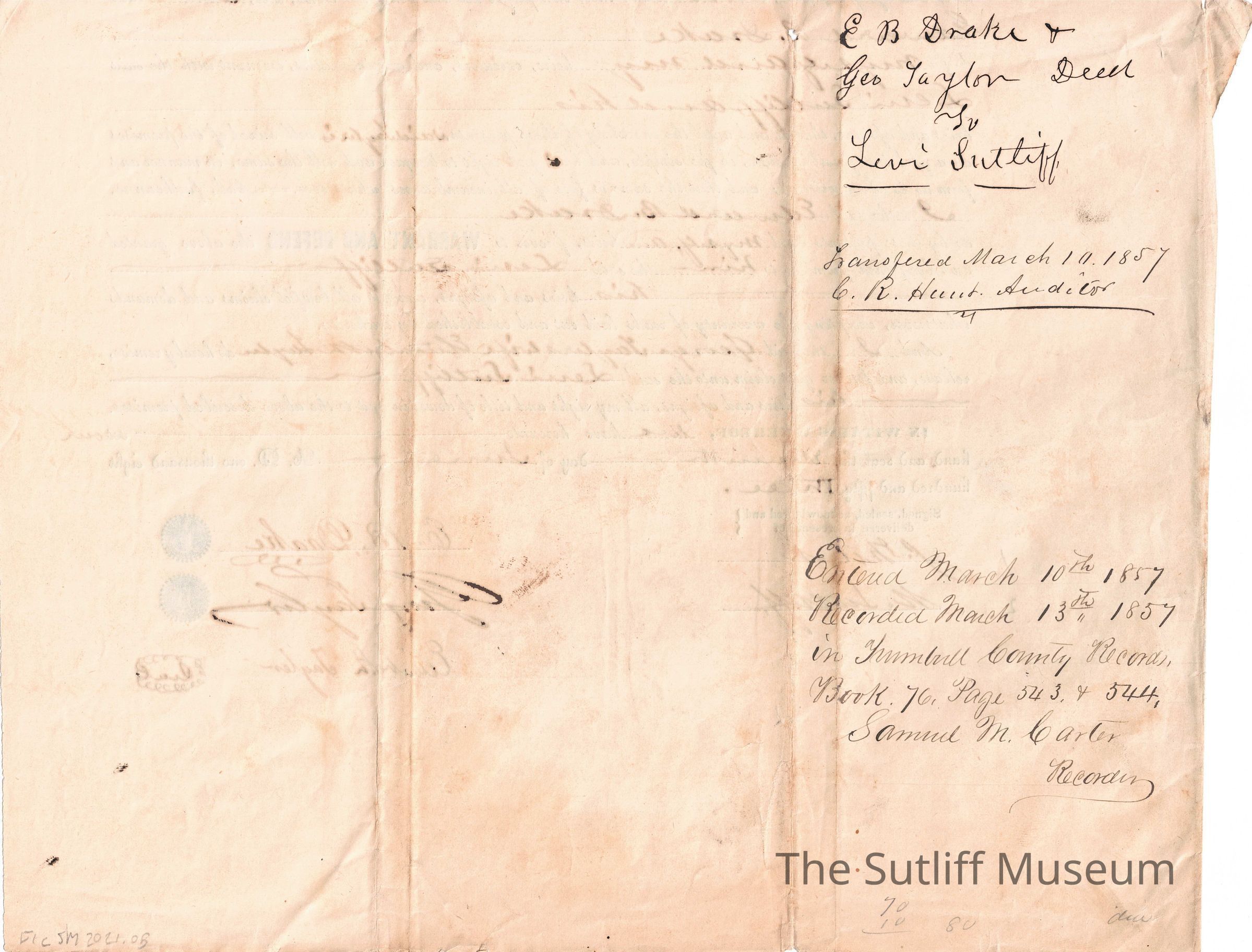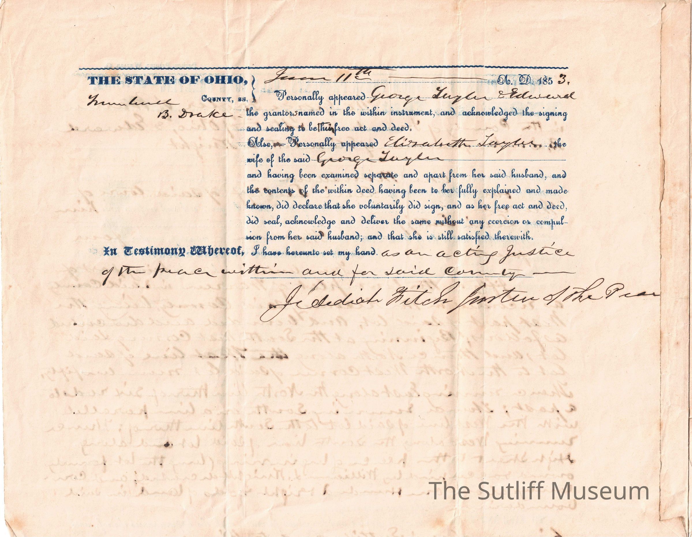 A legal document regarding the deed of land from George Taylor and Edward B. Drake, guardian of Elizabeth Taylor, to Levi Sutliff.Relationships