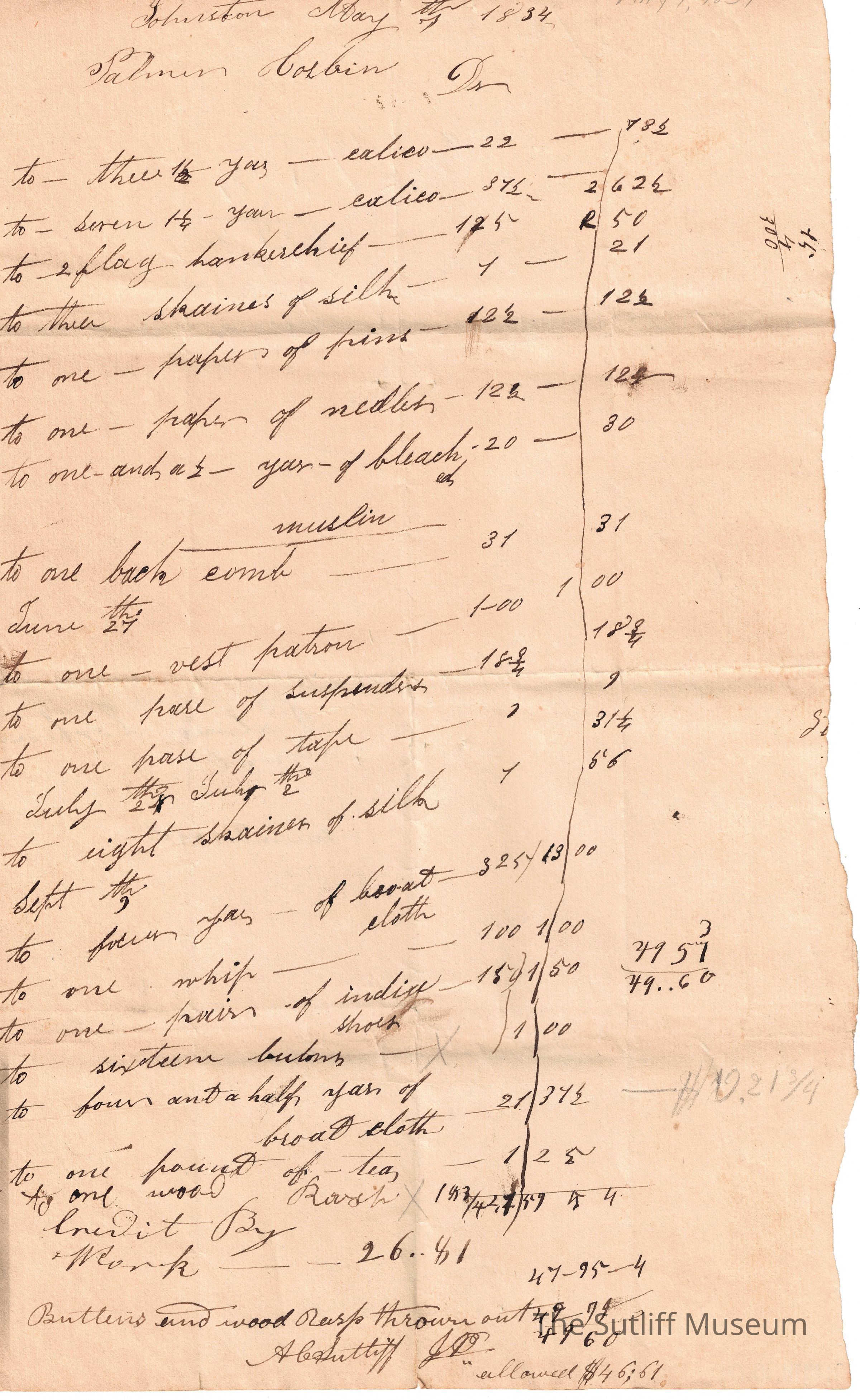 An account of goods going between Allen Curtis Sutliff and Palmor Corbins. Marks of prices, payment, goods. Acts as a receipt.Relationships