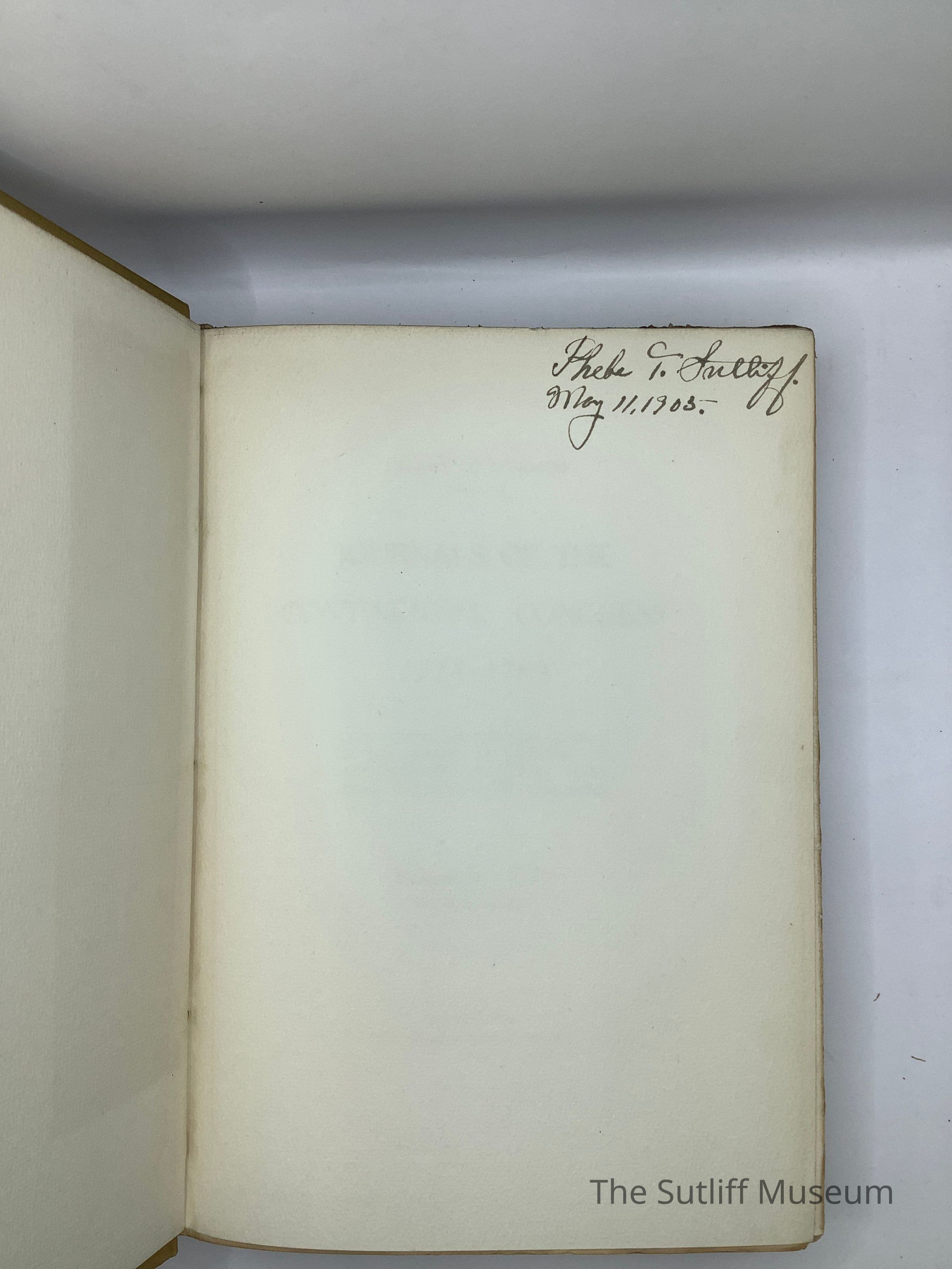 Yellow hard cover with black text on spine. 10.5 inches high X 7.5 inches wide. 256 pages. Inscription on inside front cover reads "Phebe T. Sutliff" dated May 11, 1905.Relationships