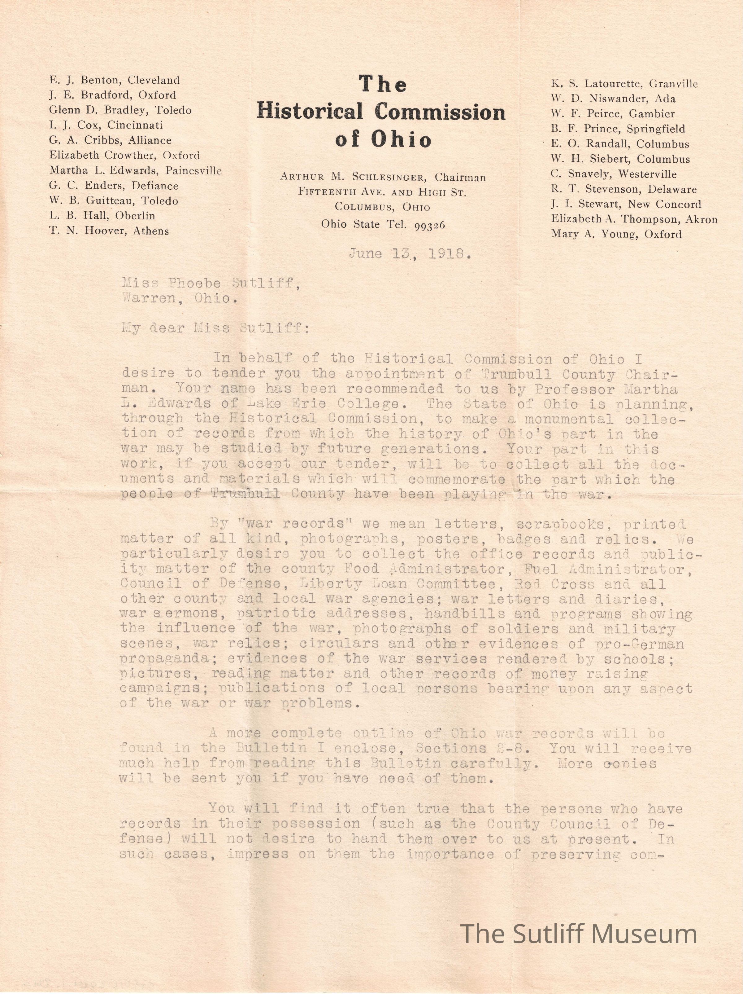A letter from Arthur M. Schlesinger, the chairman of the Historical Commission of Ohio, to Phebe T Sutliff asking her to consider joining them in the position of Chairman of Trumbull County.Relationships