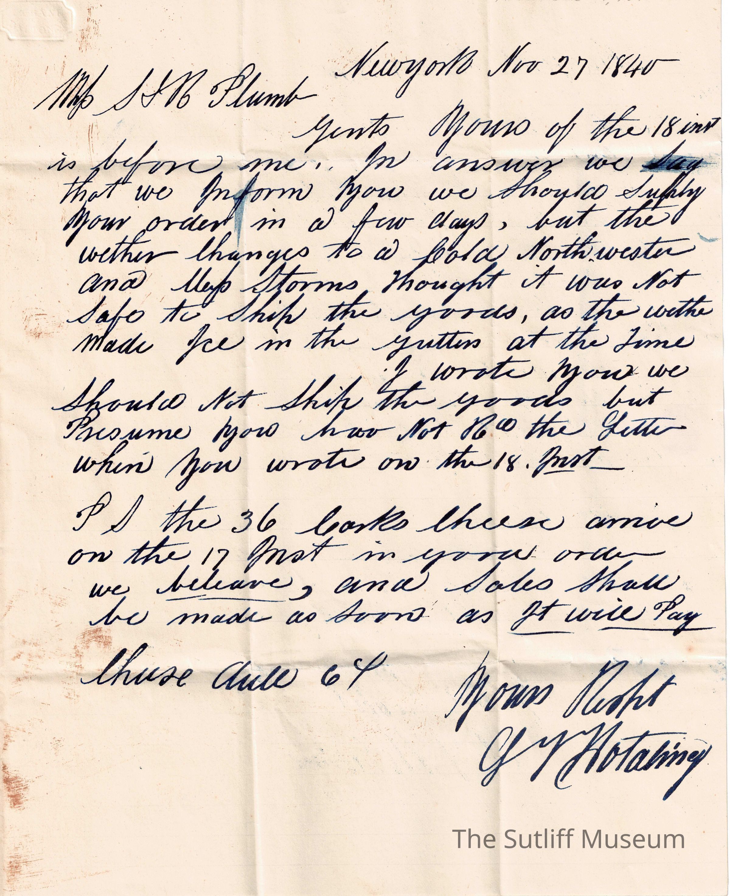 A letter from Leonard G Hotating to Samuel and Ralph Plumb regarding an update on business and shipments.Collection