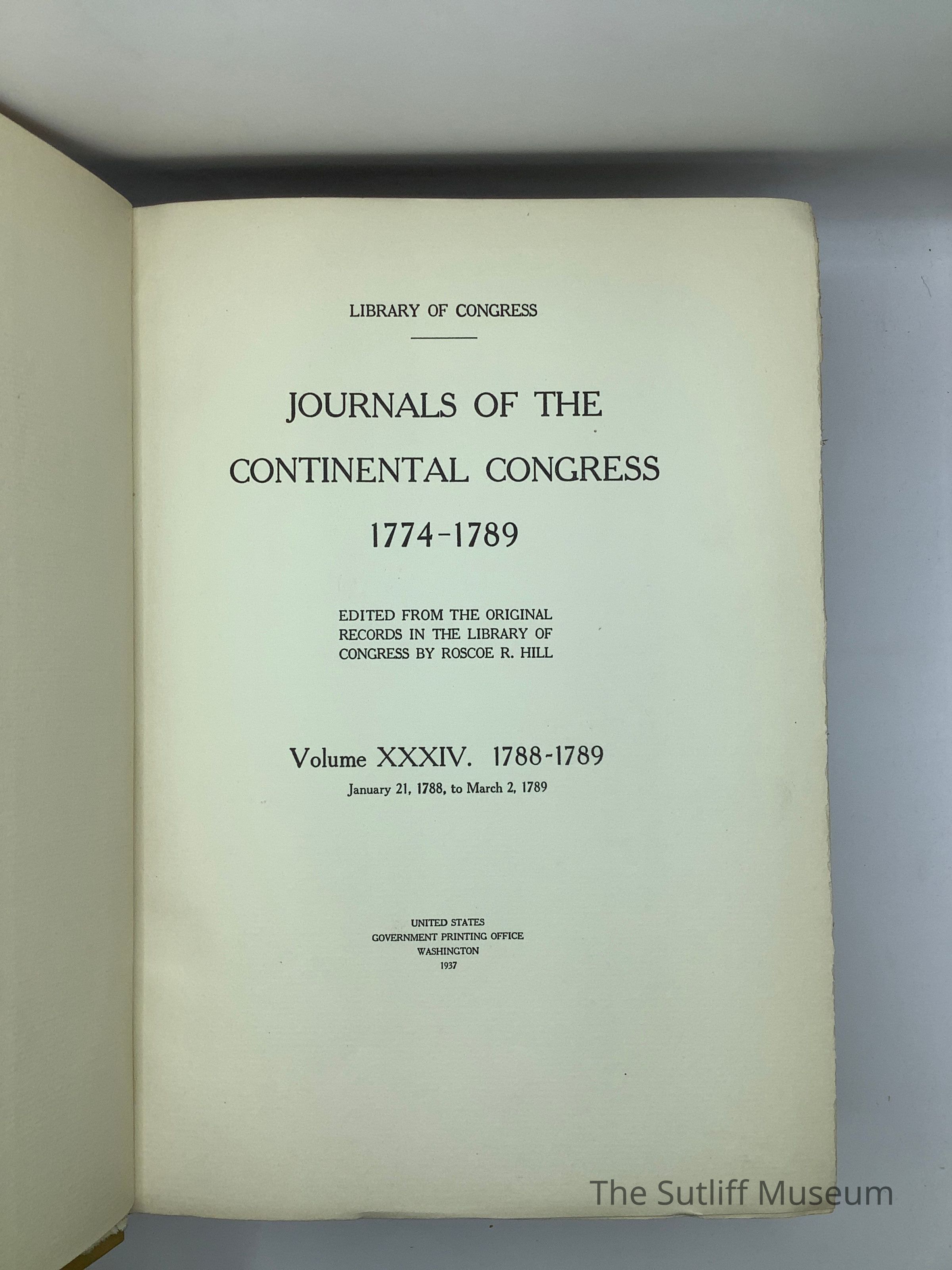 Volume XXXIV of a set of nine held by the Museum which contain journals of the Congress edited from original manuscripts. This volume contains material that runs from July 21-December 19, 1787.