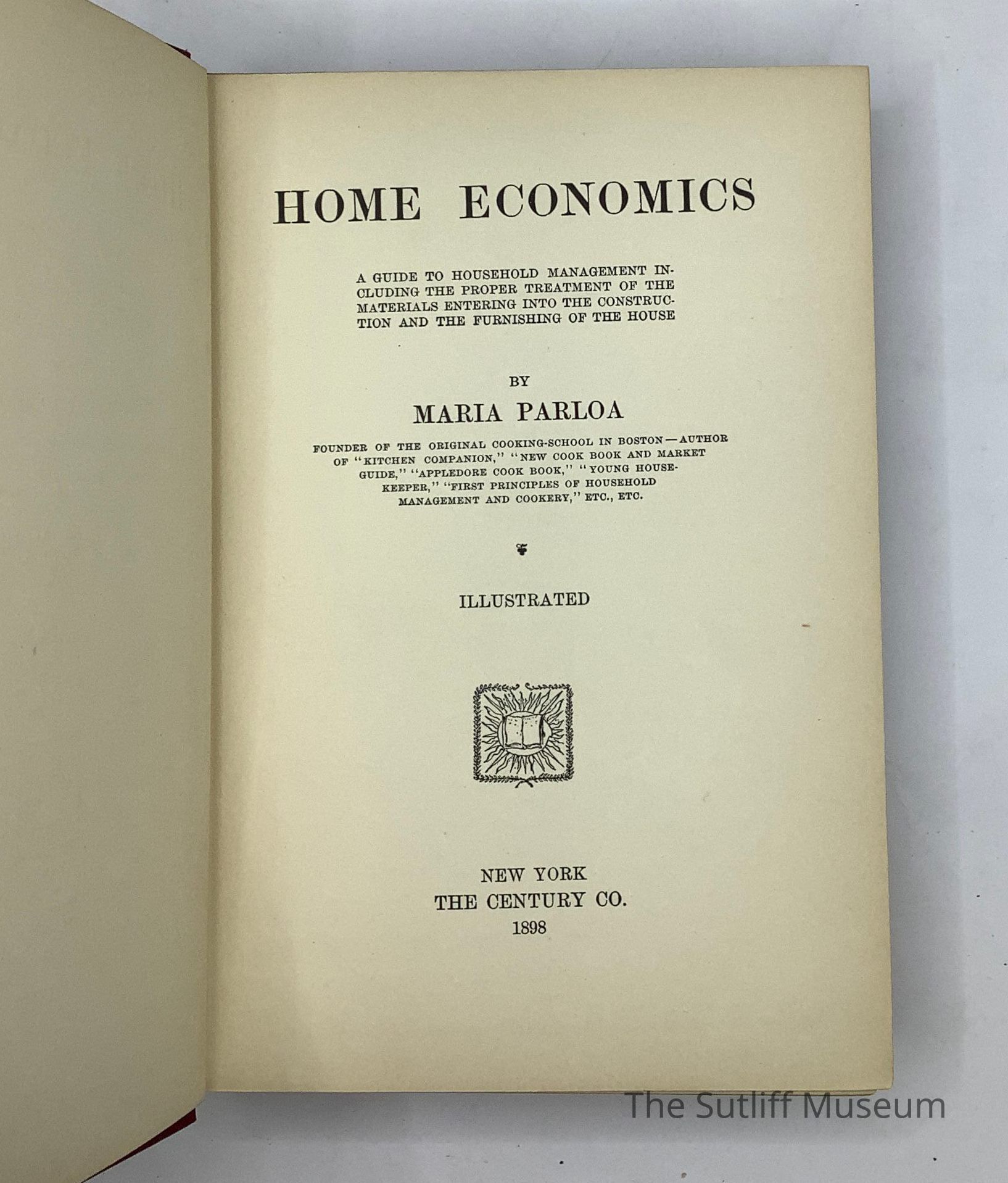 Red cloth with gold embossed title, author and publication information, with black, gold and red image of hearth on front cover. Handwritten "Phebe T. Sutliff" on frontspiece. 352 pages plus index. 7.5 inches high X 5.25 inches wide.Collection