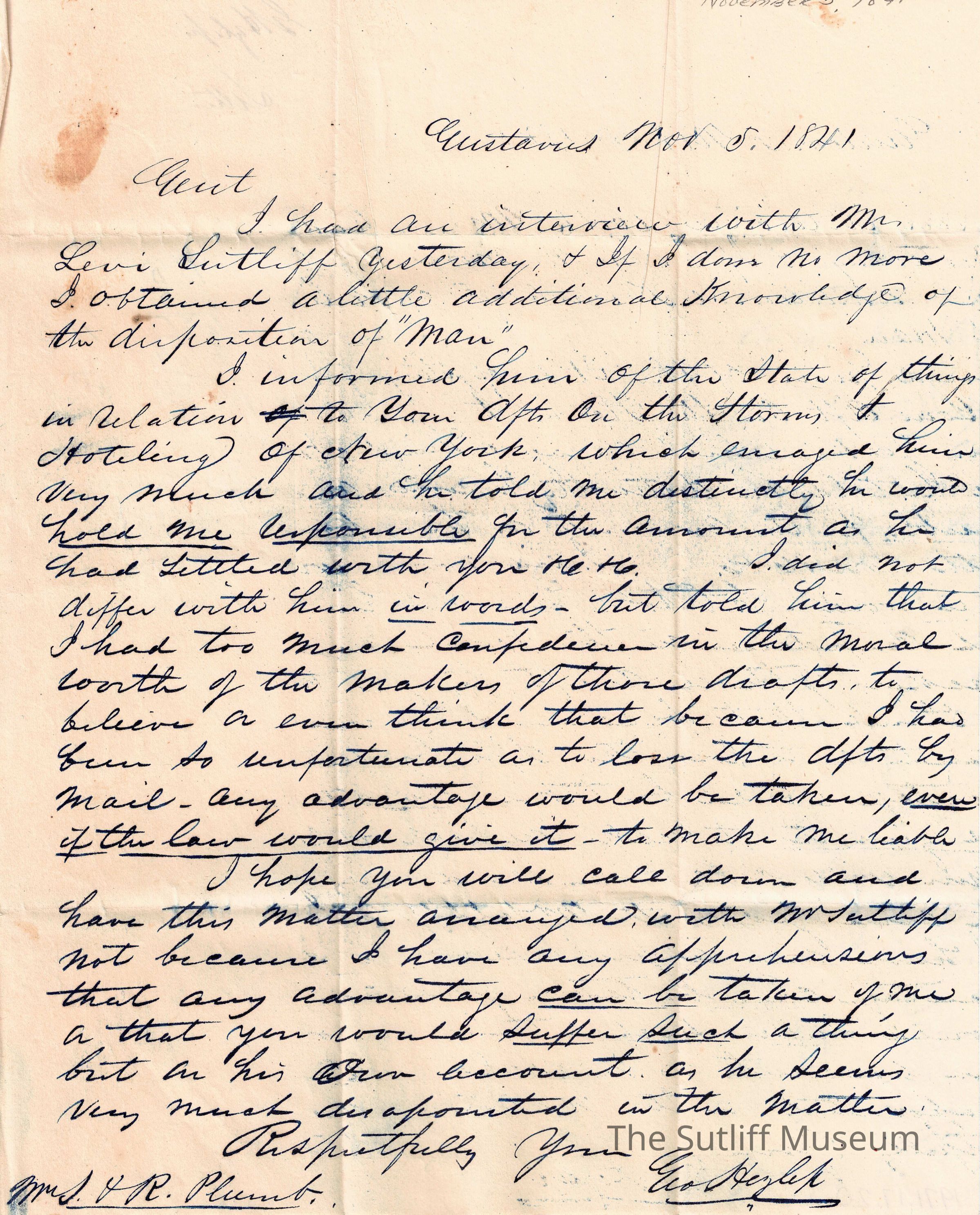 A letter from Geo Hezlek to Samuel and Ralph Plumb regarding an interview with Levi Sutliff, that he informed him of the Plumb's business, and informing them that they should reach out to Levi.Collection