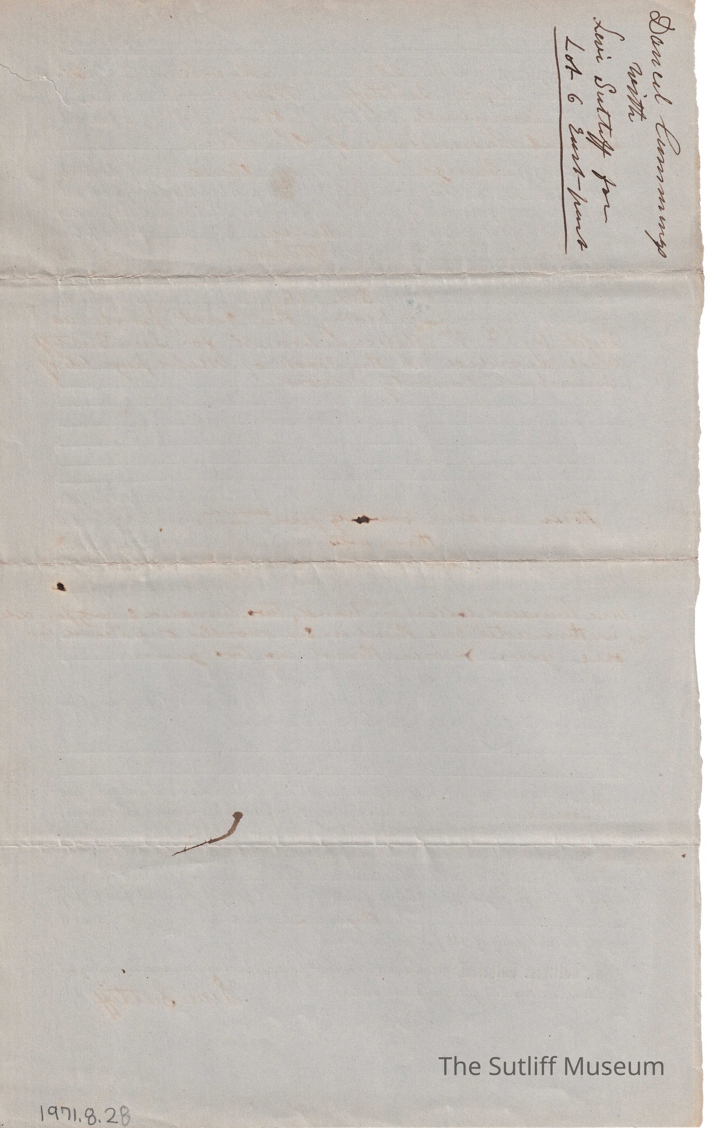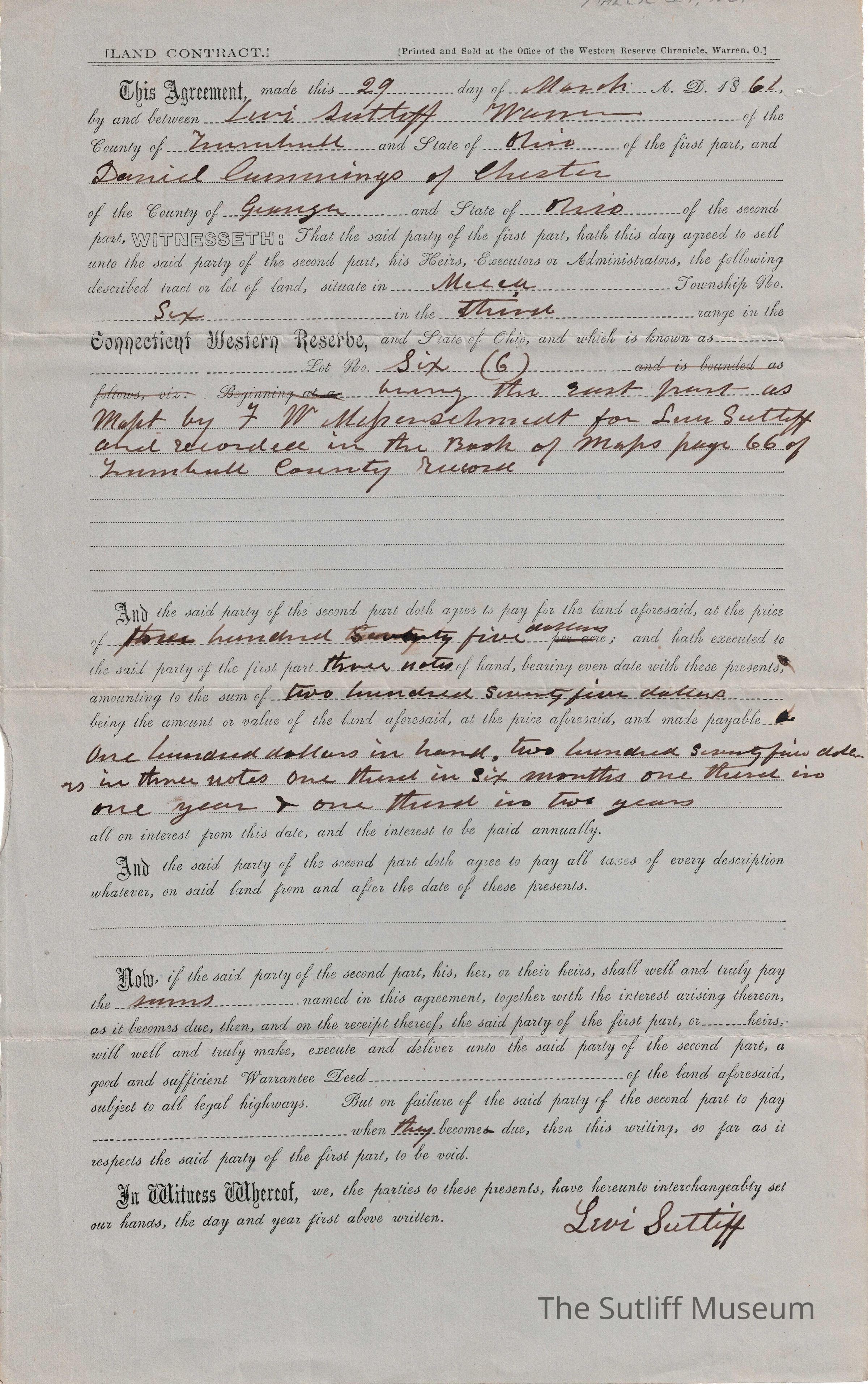 A land contract between Levi Sutliff and Daniel Cummings.Relationships