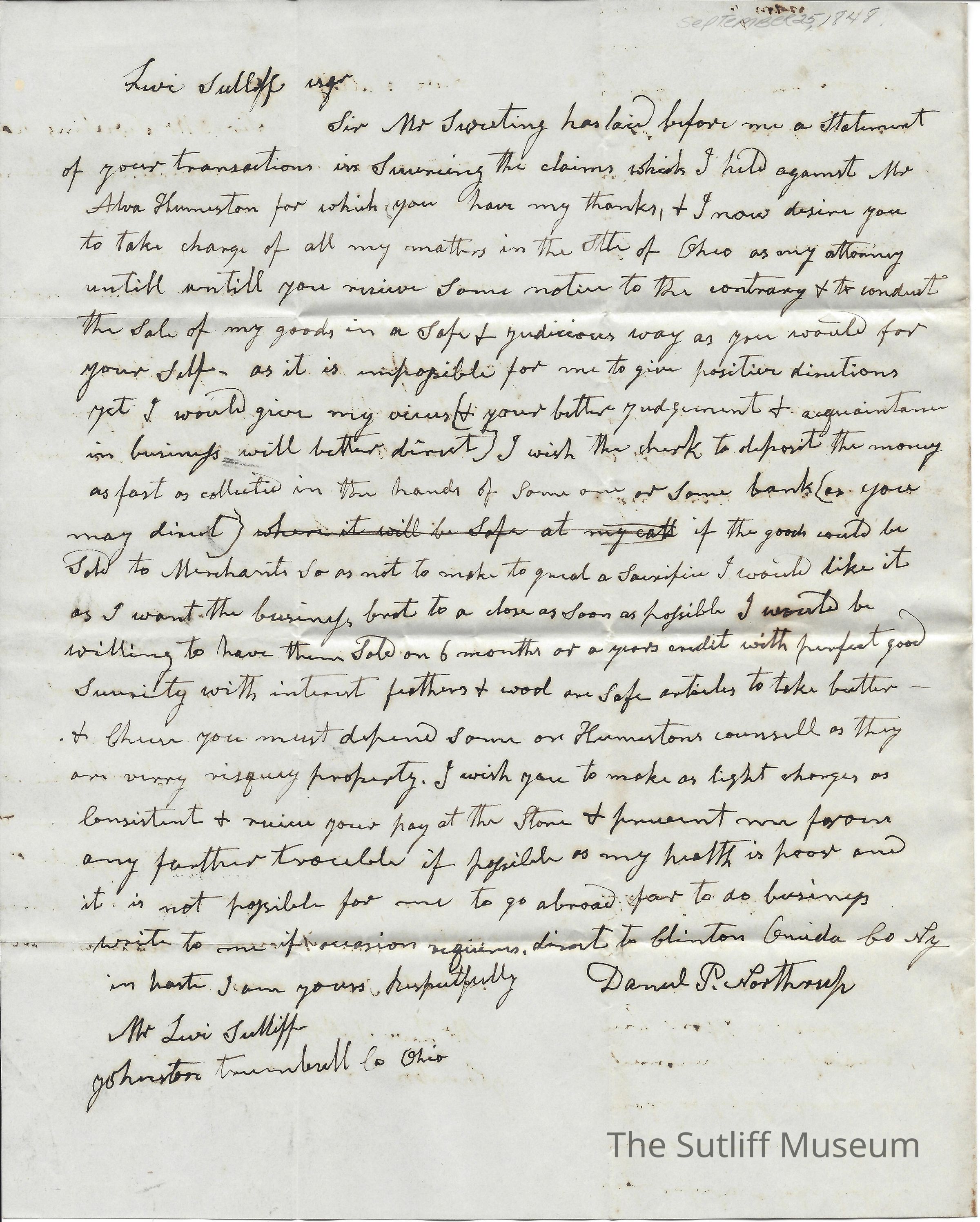 A letter from Daniel Northrup to Levi Sutliff regarding previous acts in court, the deposit of money, and the sale of goods.Collection