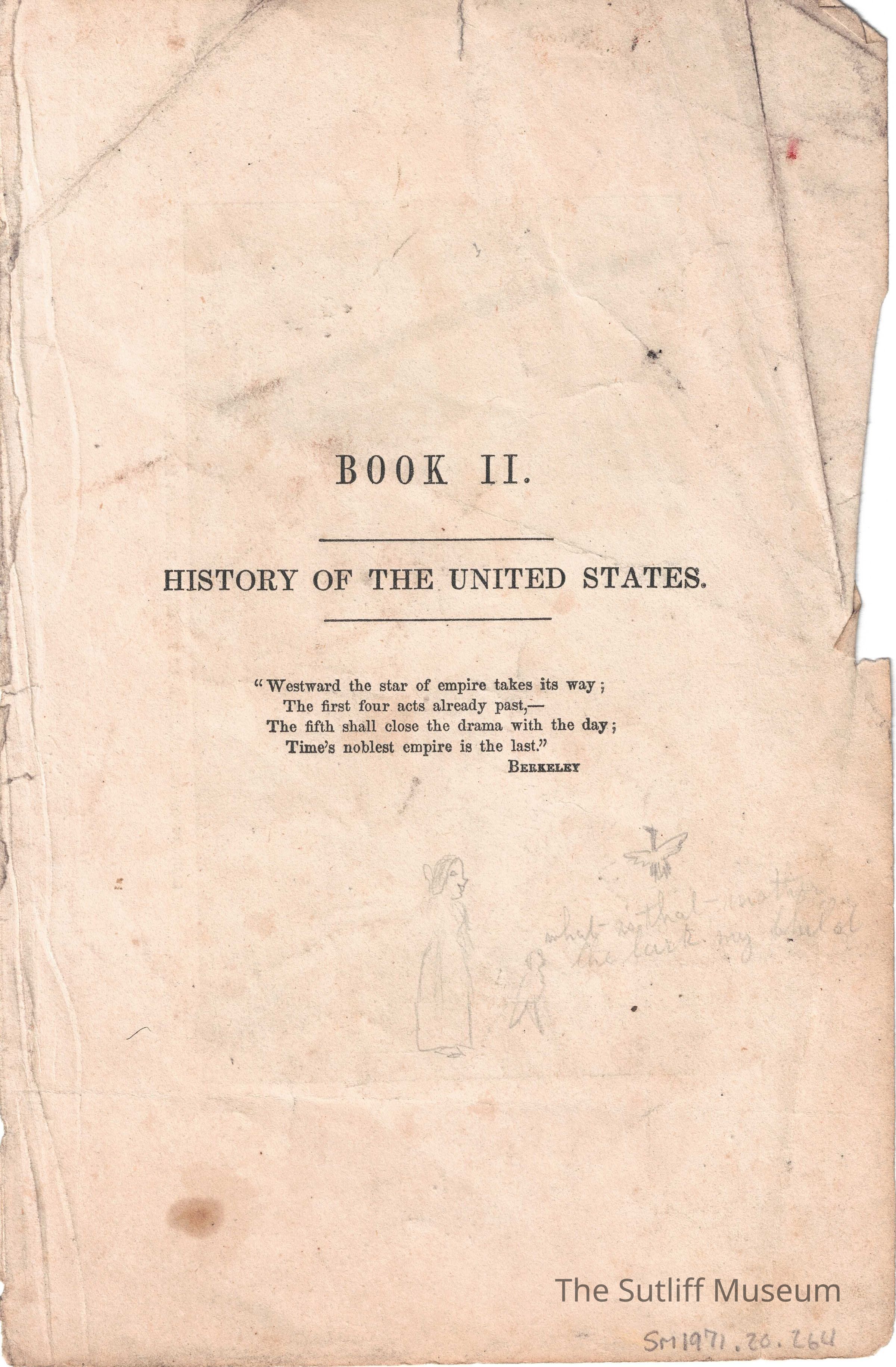 The title page of Book 2 of History of the United States. There is a small pencil drawing on the front of the page and an image titled "Landing of the Pilgrims at Plymouth" on the back. Undated.Collection