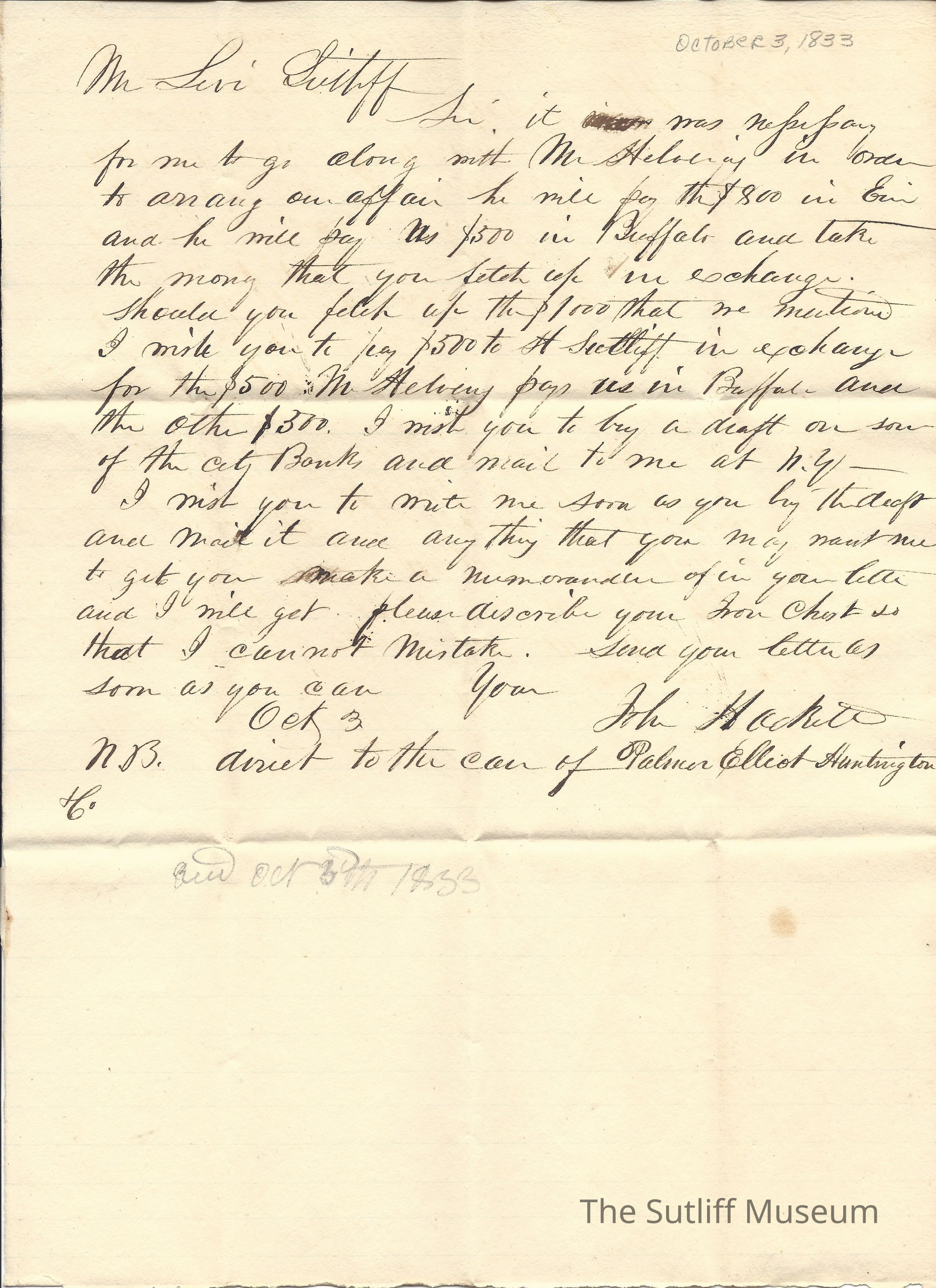 A letter from John Hackett to Levi Sutliff regarding payment being split with Mr. M, and requesting he write back as soon as possible.Collection