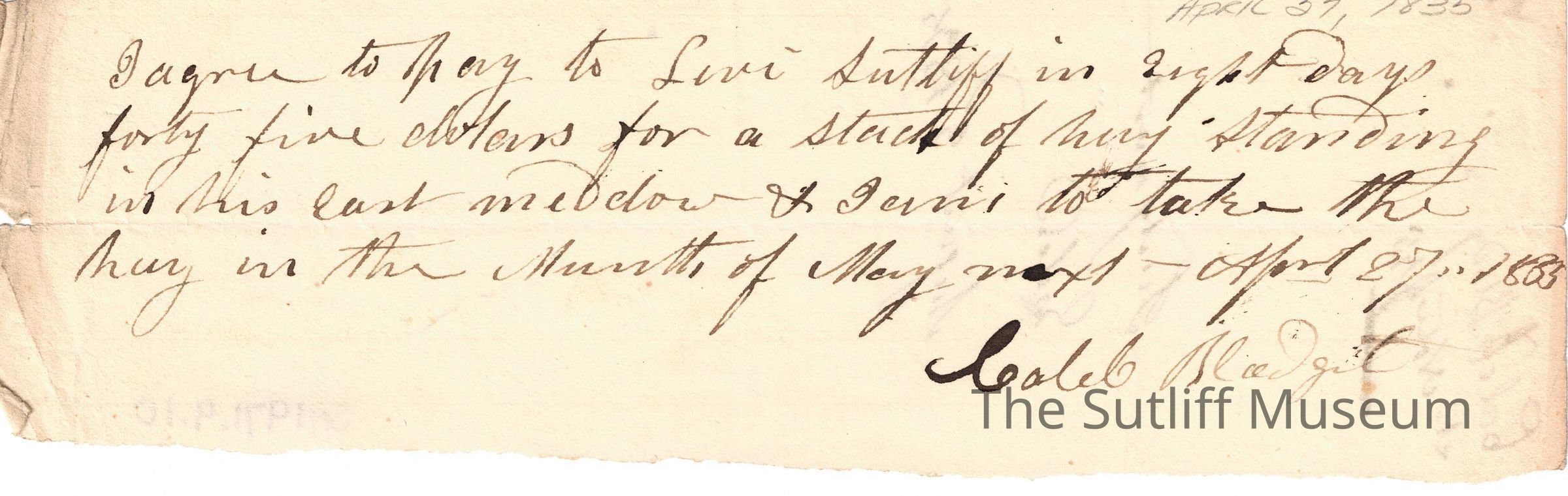 A letter from Caleb Blodget to Levi Sutliff regarding an agreement to pay Levi Sutliff for a stack of hay.Collection