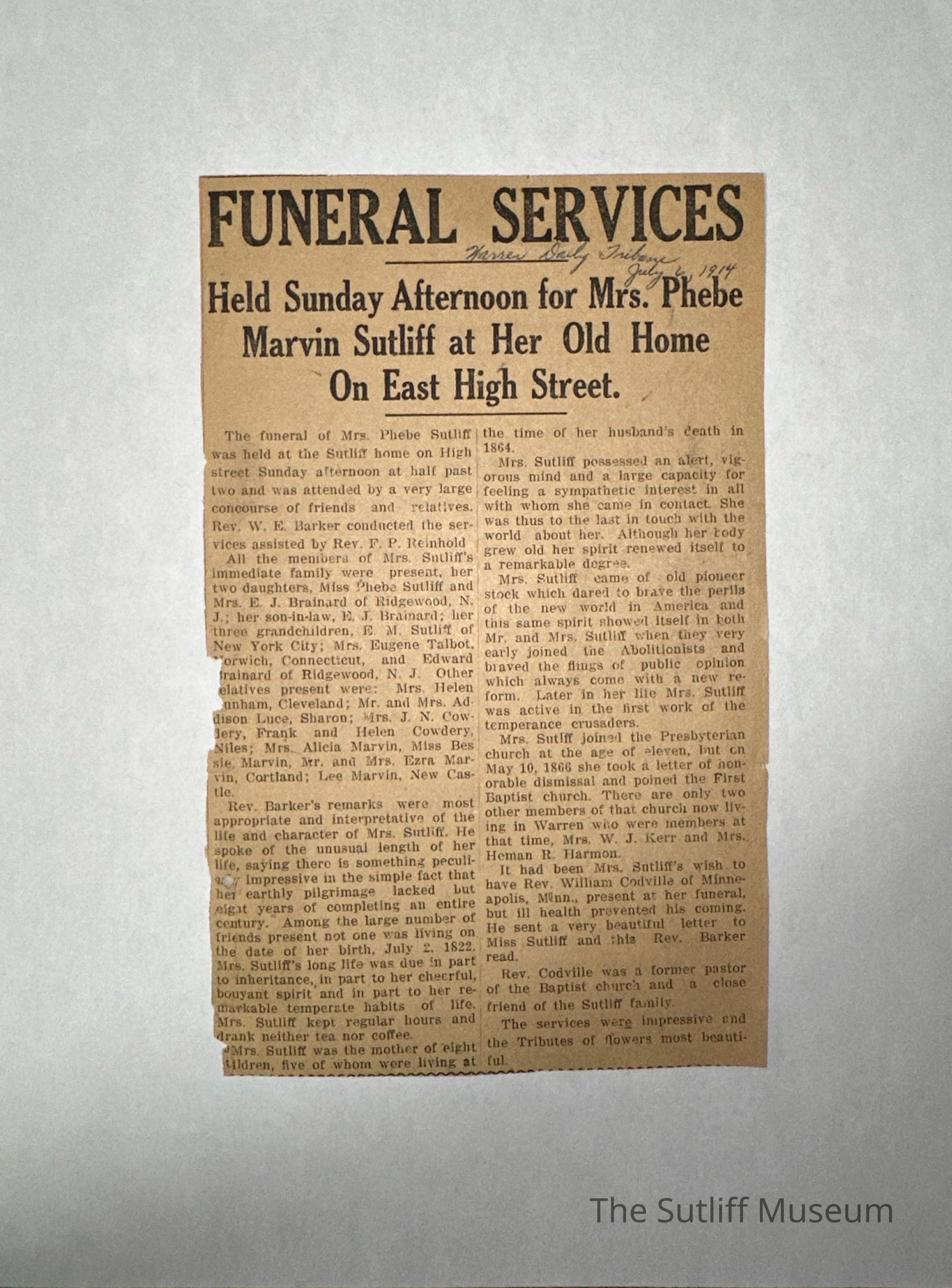 Newspaper clipping with an overview of Phebe Marvin Sutliff's funeral dated July 6, 1914.Collection