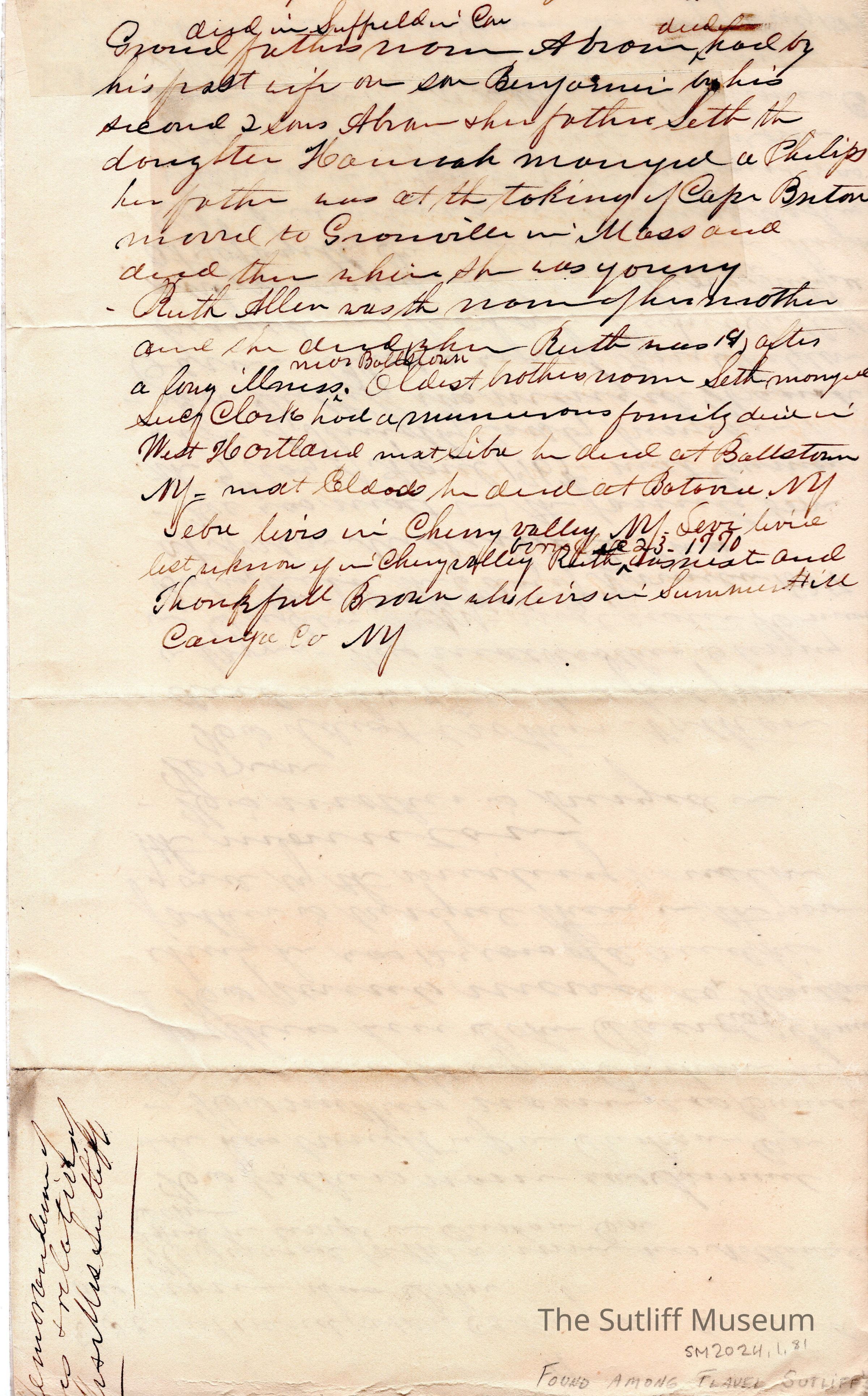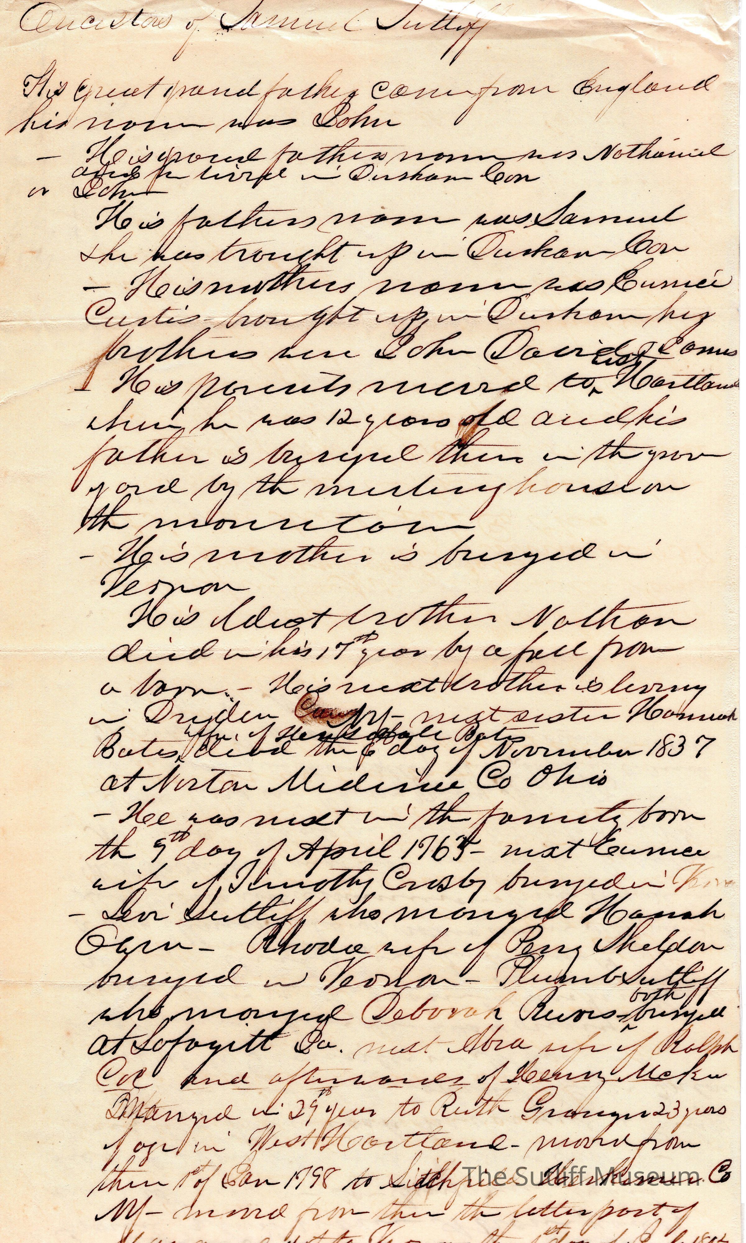 A document found among Flavel Sutliff's letters regarding a memorandum of Mr. and Mrs. Sutliff's ancestors.Relationships