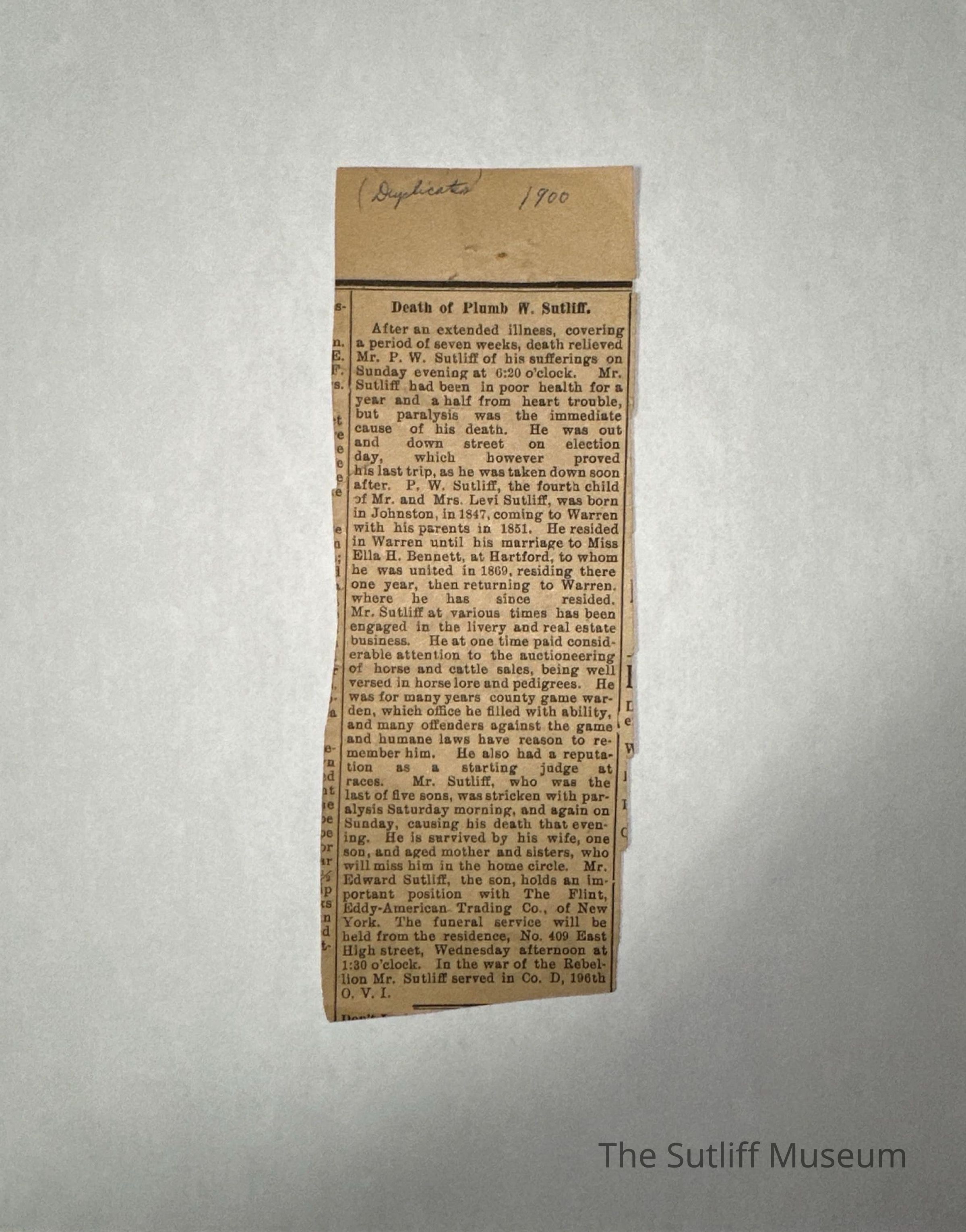 Newspaper clipping with the obituary of Plumb W. Sutliff dated 1900Collection