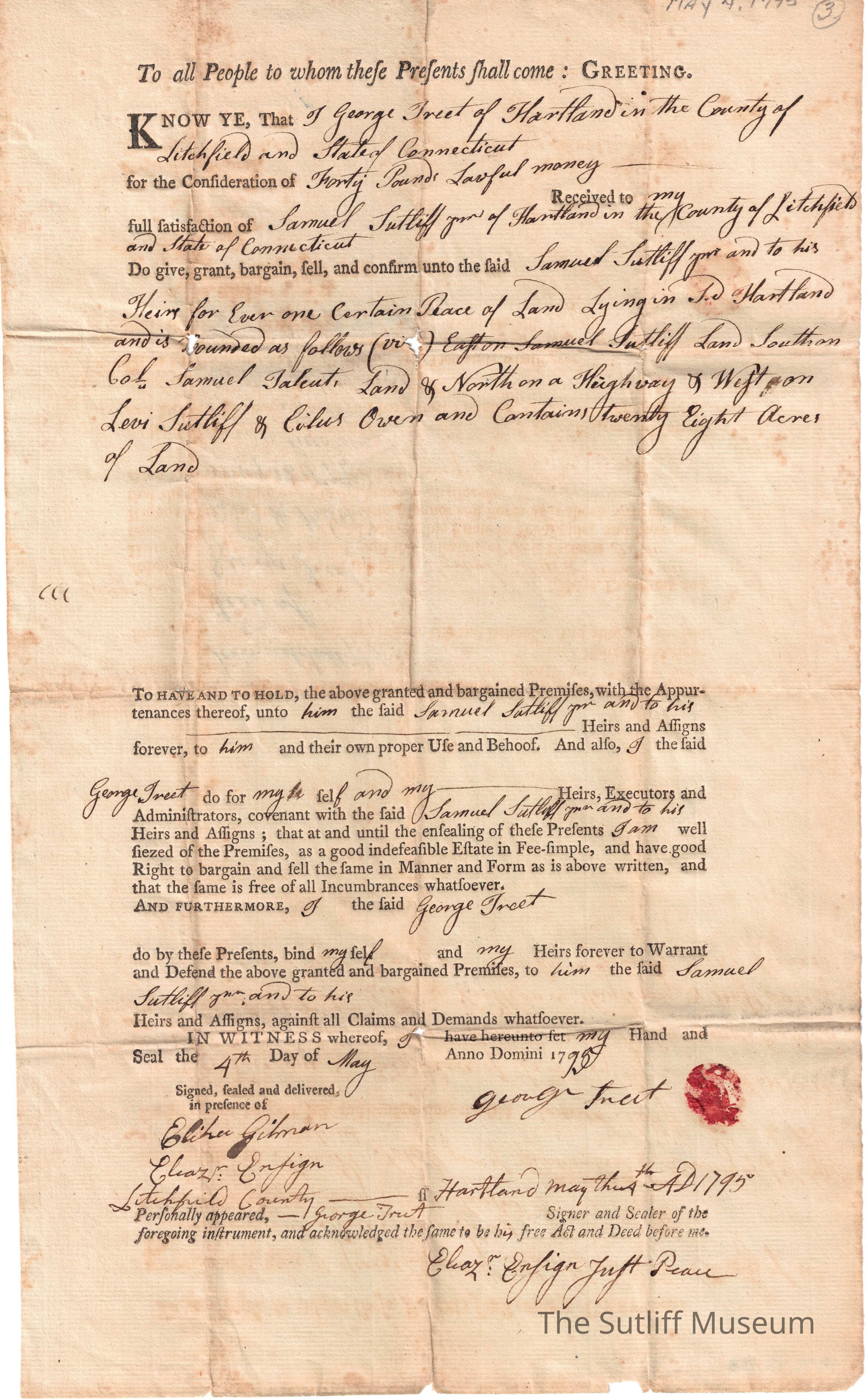 Deed between Samuel Sutliff and George Treet