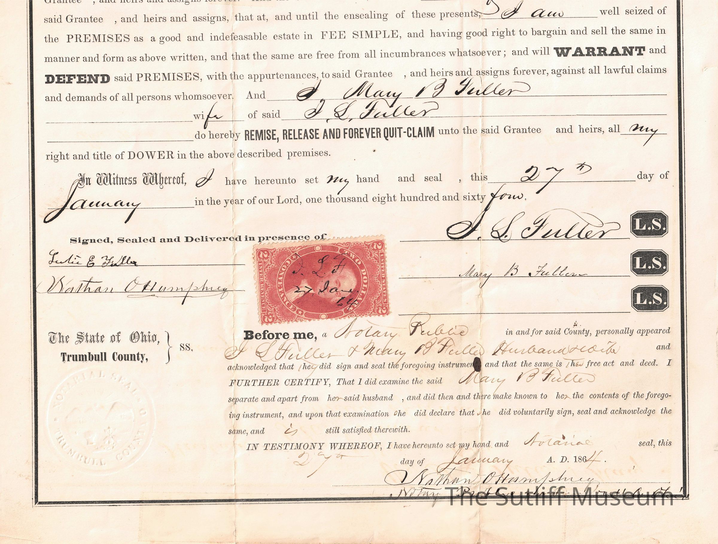 A deed from I.S. Fuller and Mary B. Fuller to Levi Sutliff declaring the sale of land for $1500.Collection