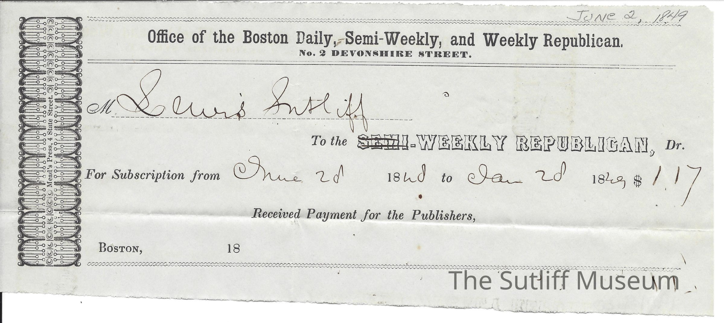 A subscription notice from Lewis Sutliff to the Boston Weekly Republican.Collection
