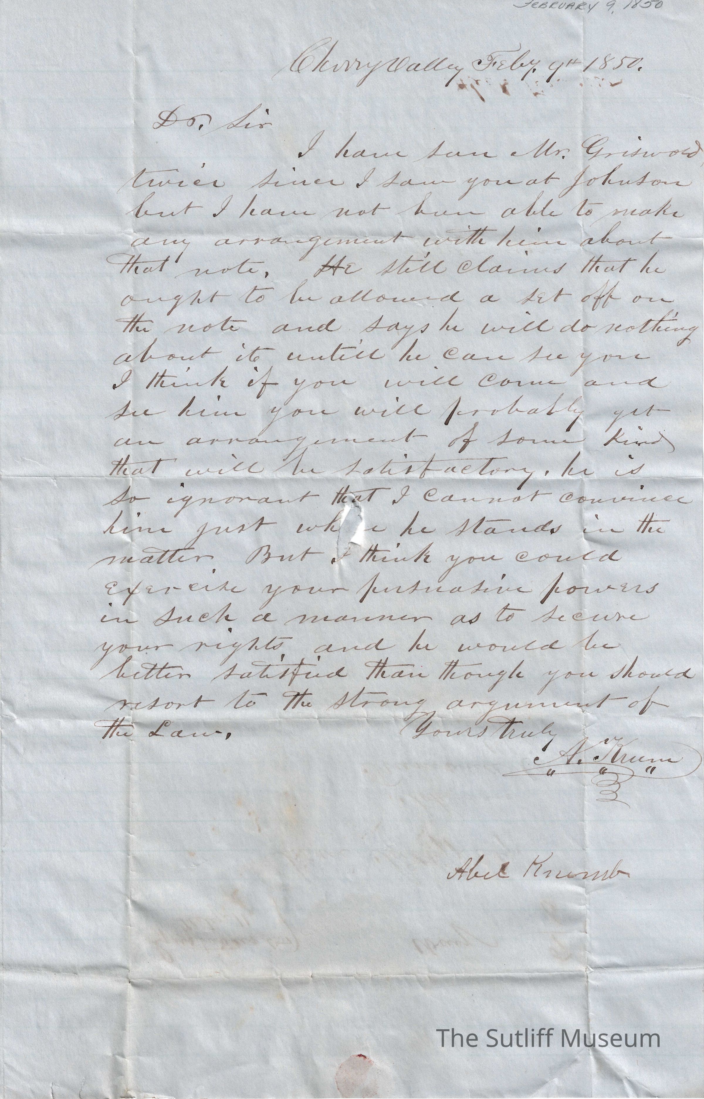 A letter from A. Krumb to Levi Sutliff regarding Mr. Griswold and him being difficult, he recommends that seeing him in person might make him more agreeable.Collection