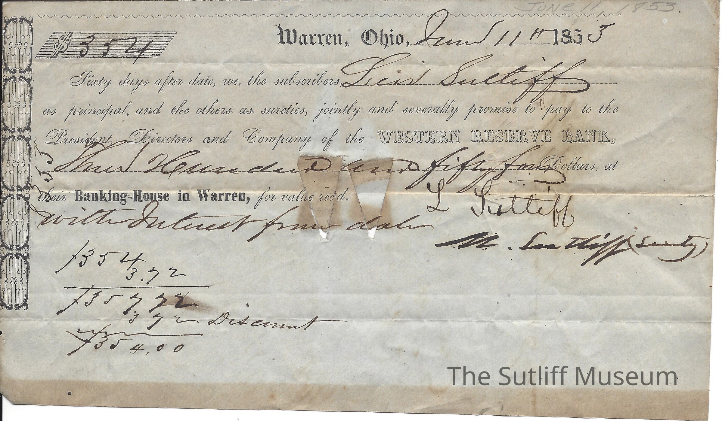 A promise to pay from Levi Sutliff to Western Reserve Bank.Collection