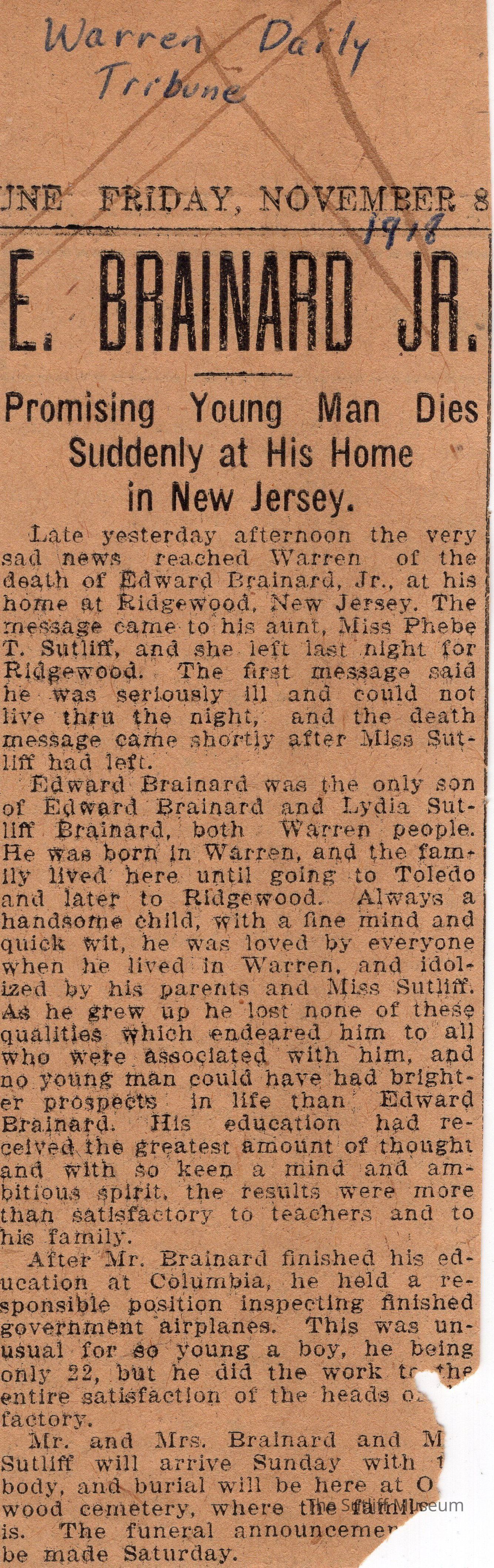 Newspaper clipping titled "E. Brainard Jr. Promising Young Man Dies Suddenly at His Home in New Jersey" from the Warren Daily Tribune on November 8, 1918.Archive Details
