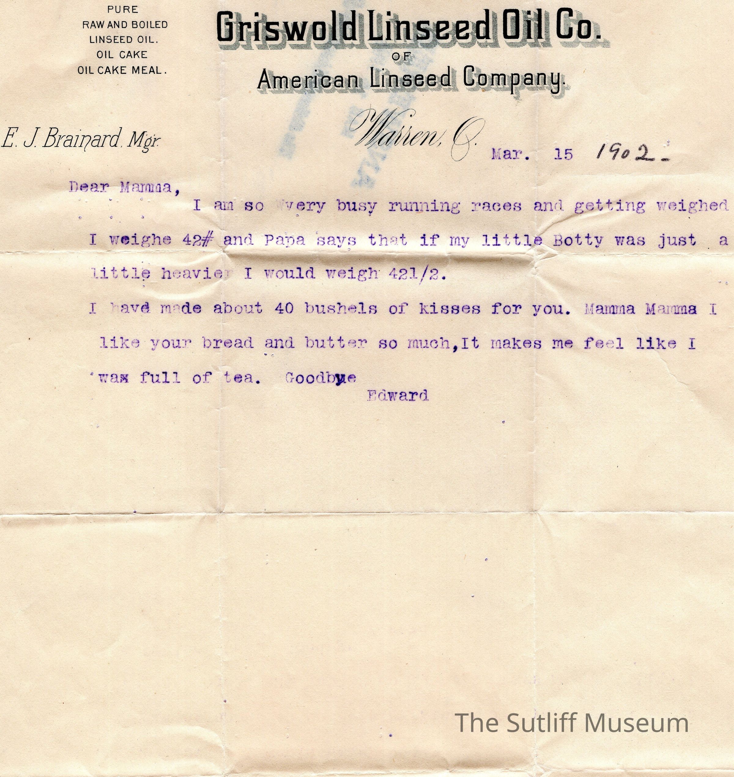 Letter from Edward S. Brainard to his mother Lydia Sutliff Brainard from his dad's office.Archive Details