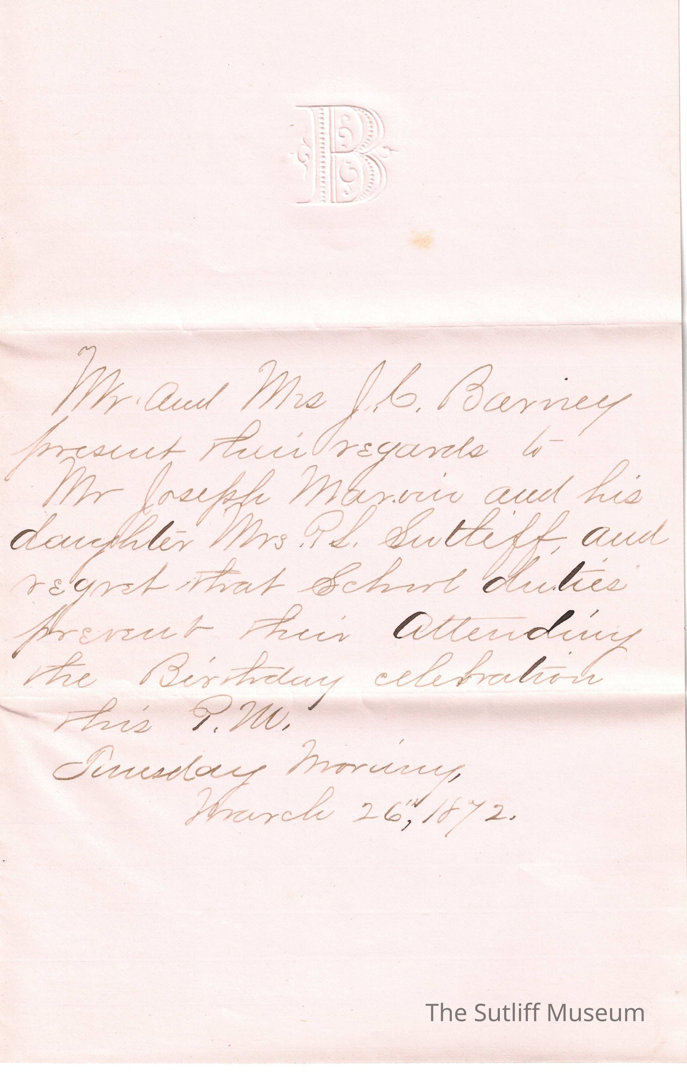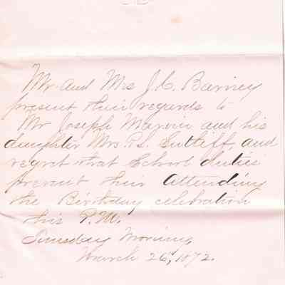An envelope and invitation to Joseph Marvin from Mr and Mrs. J.L. Barney with their regrets about being unable to attend his 100th birthday party due to work obligations.Collection