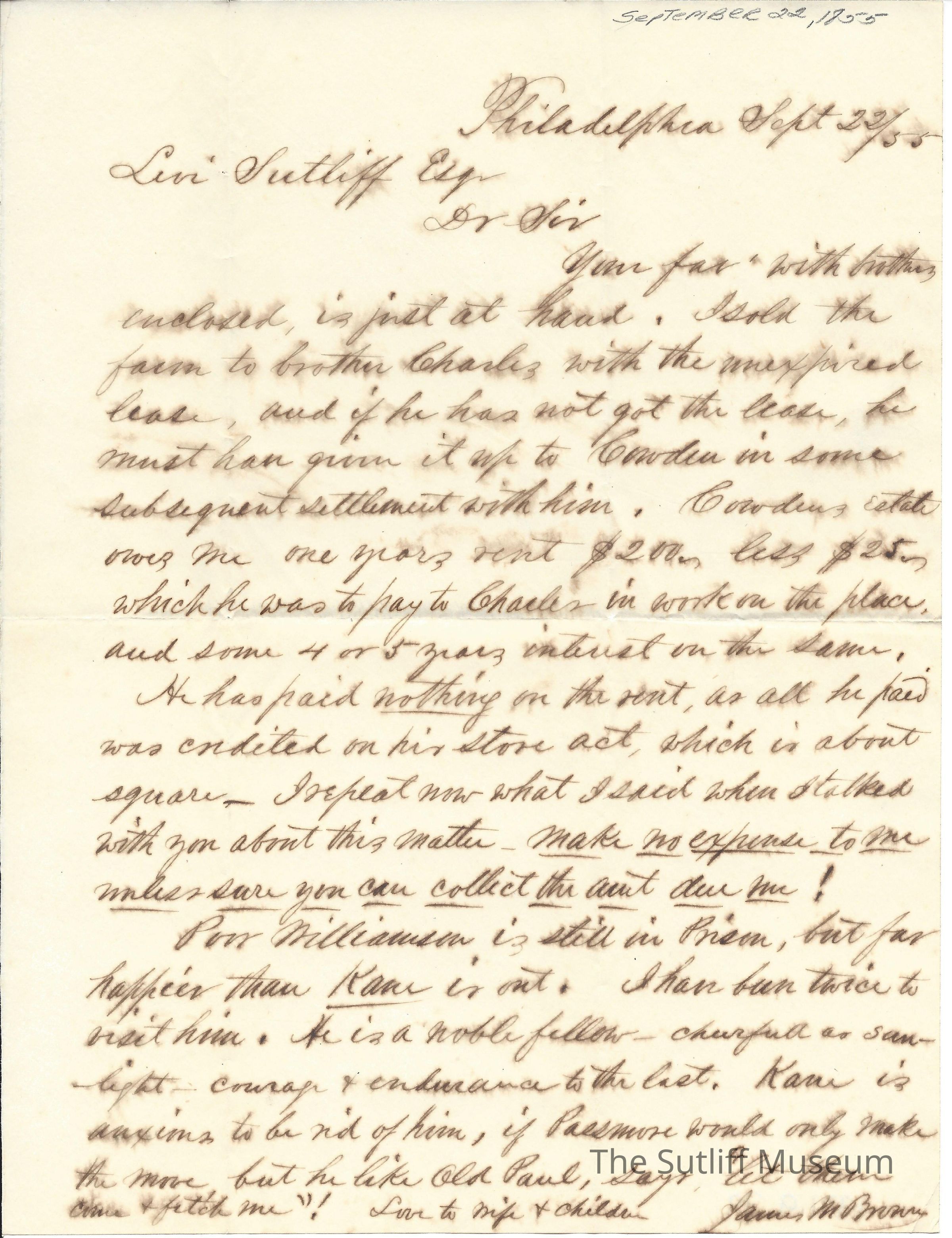 A letter from James M. Brown to Levi Sutliff regarding Brown selling his farm, the rent payment, and that Williamson is still in prison.Collection