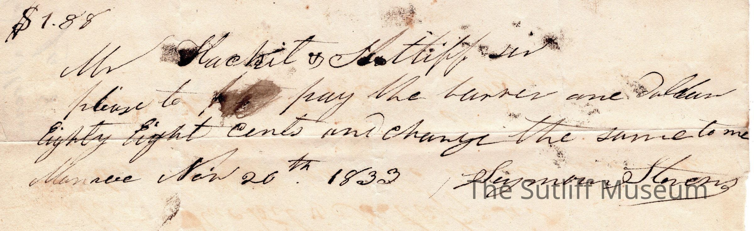 A note from Seymour Stevens to Messrs. Hackett and Sutliff regarding a payment.Relationships