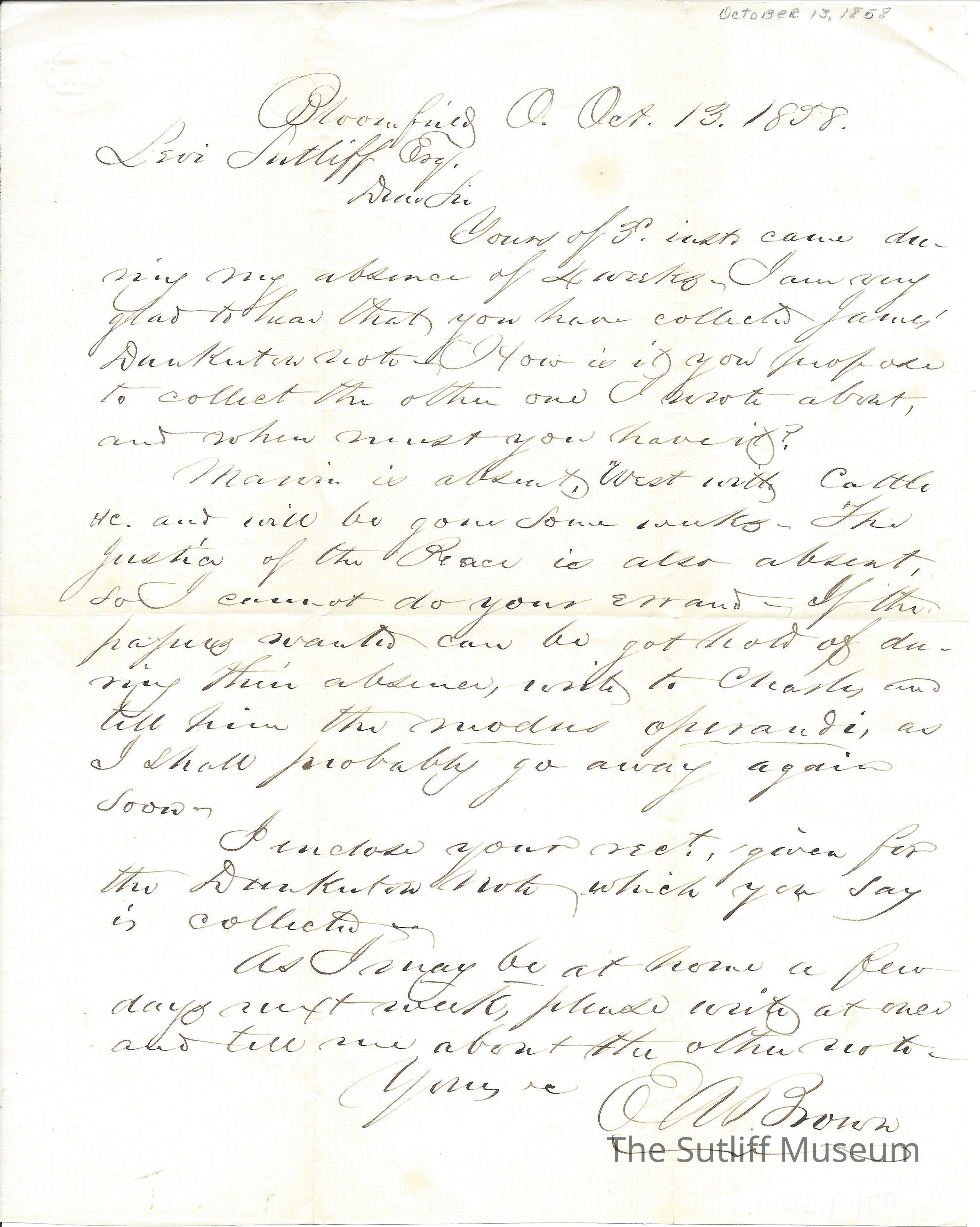 A letter from E.A. Brown to Levi Sutliff regarding James Dunkerton and people being absent.Collection